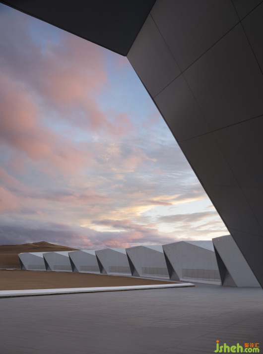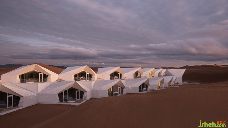 臺灣現(xiàn)代舞舞團“云門舞集”有個舞叫《流浪者之歌》 ,用了3噸半的稻谷。它背后的創(chuàng)作故事來自于創(chuàng)始人林懷民有一次在紐約園里看到一群黑人小孩在玩沙,他就想,在舞臺上弄上沙,也很有趣的吧。對設計師杜恒來說,在沙海里弄酒店,也會很有趣。酒店的設計初衷是將建筑和室內的氣質糅合在一種天地大美而不言的力量感里,想象它更像是風與沙共舞的筆觸,勾勒出有棱角有力量感的輪廓,與起伏的沙丘融為一體,展現(xiàn)出一種流動而穩(wěn)定的美。