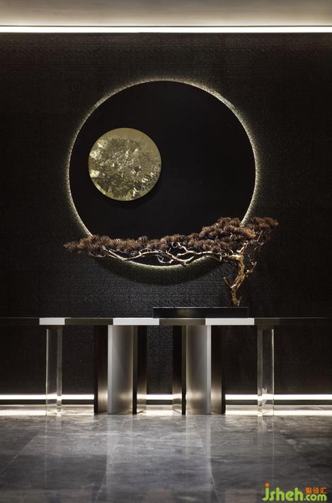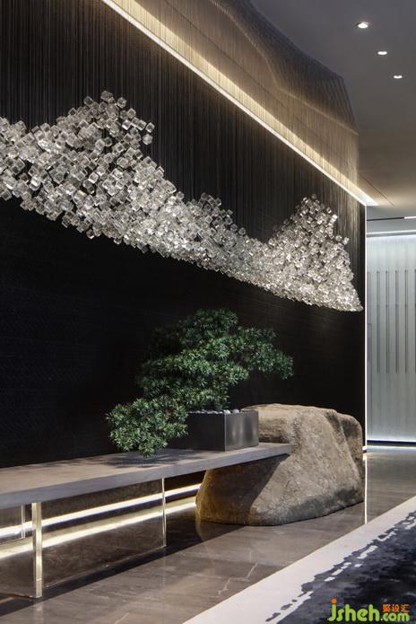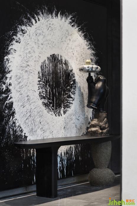 靜謐的黑,懸于之上的燈像裝置藝術(shù)一樣,與雕塑互映成畫,室內(nèi)設(shè)計師空間美感在組成畫面中帶給人的視覺感受的力量是可以感知并觸摸得到的東方美學......