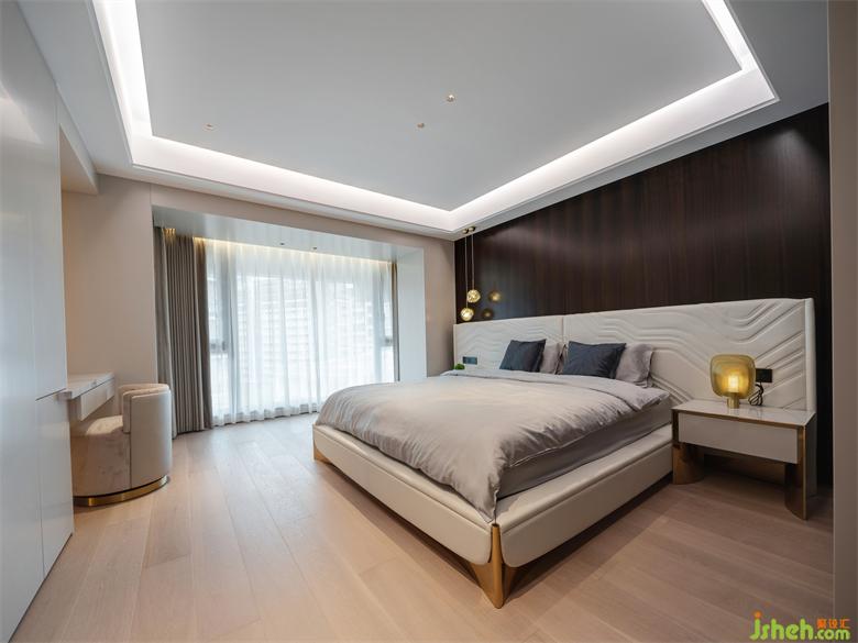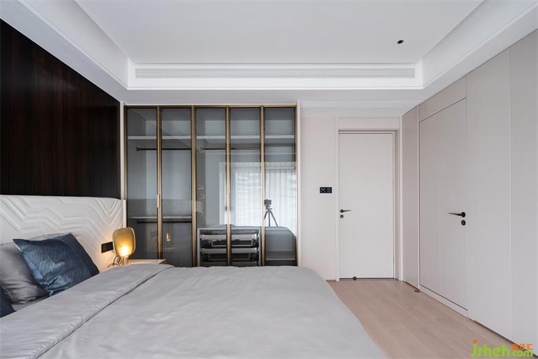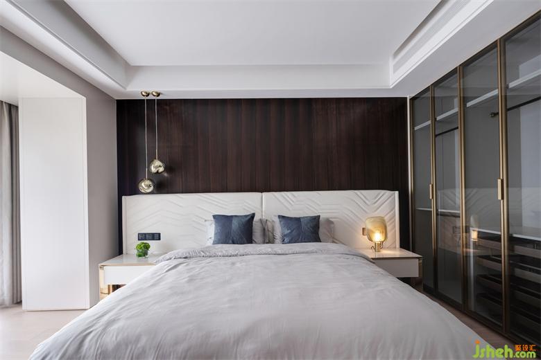 家居裝修更衣間與衛(wèi)生間從主臥背景一側(cè)的暗門進入,暗門的運用保證了空間的私密性和墻面的統(tǒng)一完整性。雙洗漱臺的設(shè)計更加貼合屋主的使用需求。