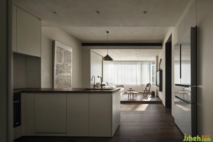 4厘米厚純胡桃實木廚臺面,1.8米長胡桃木餐桌,密字書法、定制純黃銅吊燈,訴說著無以言表的阡陌流年。