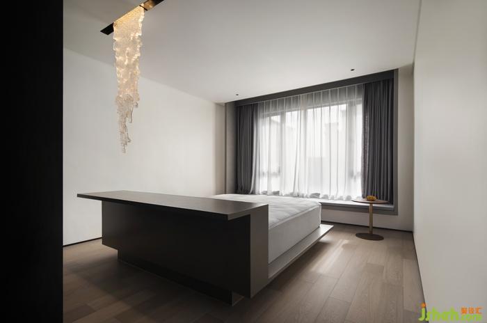 環(huán)島式設(shè)計(jì)的主人房,把床與書桌合拼為一體,定制亞克力流水狀吊燈傾流而下,廣州別墅裝飾為整個(gè)臥室注入絲絲清韻。坐在吊掛長條卡座,春風(fēng)路過窗臺(tái),喊我們一起熱愛生活。