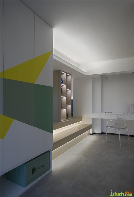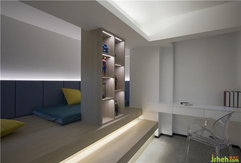 小孩房榻榻米邊上設(shè)置了軟包保護,同時簡化了空間脈絡(luò),把盡可能多的空間騰出來,讓收納柜里漫威宇宙的英雄人物陪伴孩子在大片的空地上自由自在的玩耍。