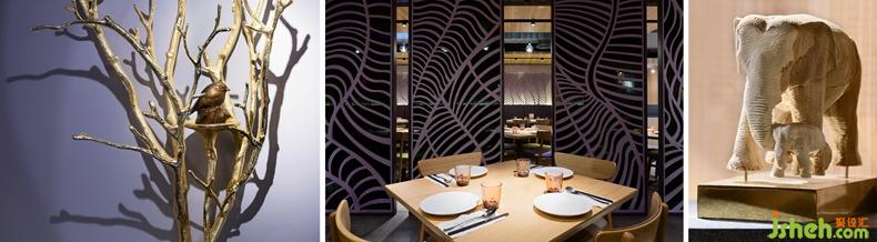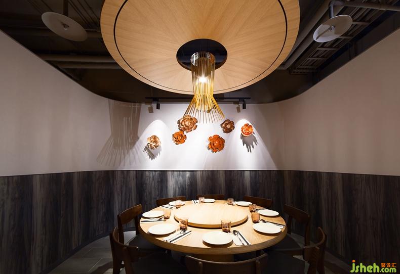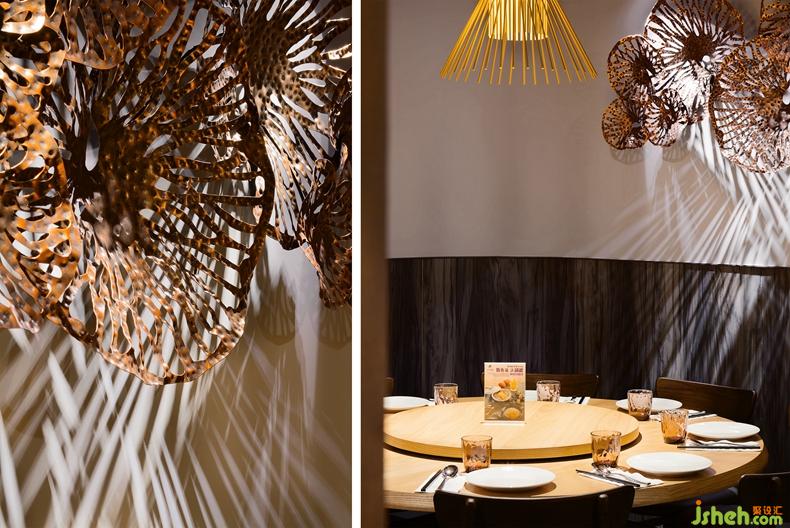 黑玻的深,收邊的醇厚鐵灰,格柵后洗墻的淺灰,露明天花的白灰,窯變紋路的亮灰,卡座的紫灰,堆砌后為之一亮的是格柵的粉紫,帶來溫度的是白栓木紋,于天于壁,突顯回歸桌上,那些紅的白的,綠的澄的艷麗菜色。餐廳設(shè)計