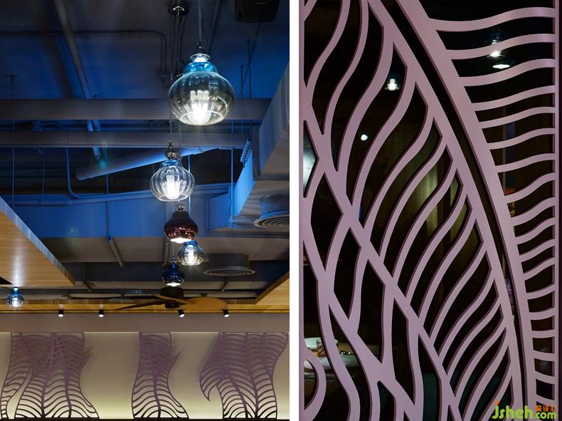將元素抽象化后的隔屏作為視覺重心,視覺焦點并非以投射燈強調(diào),而是著重在反光和穿透的同時進行所造成的效果:明亮的周圍格柵由洗墻滲出反光,以及另一側(cè)穿透黑玻格柵的光線,加上本身格柵的紋路,創(chuàng)造了明暗乍現(xiàn)的芭蕉叢林內(nèi)外互望的氛圍。