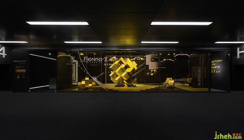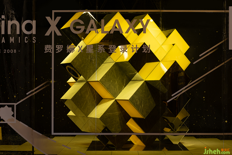 在展位內(nèi)部,分布著代表“費(fèi)羅娜X星系”的主體裝置以及代表其他產(chǎn)品系列的小裝置群,品牌瓷磚、鏡面與黃色發(fā)光亞克力相互映襯,為規(guī)則排布的方塊矩陣加入酷炫視覺效果。