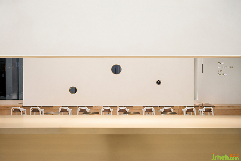 天花造型向下與吧臺形成呼應(yīng),與面向兩側(cè)的定制座椅相結(jié)合,而圓形開孔處理讓人聯(lián)想到奶蓋中的氣泡,增加靈動趣味的感受并增強空間的社交屬性。