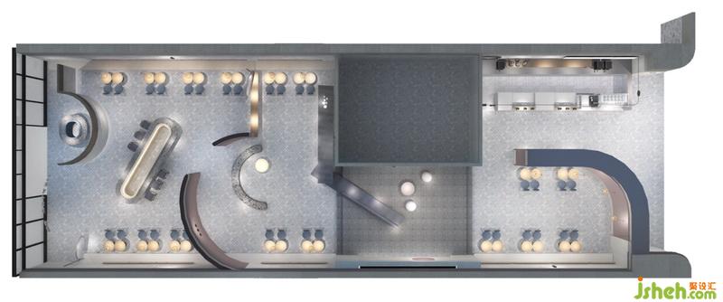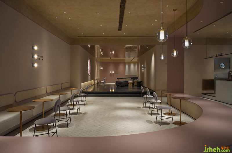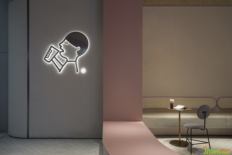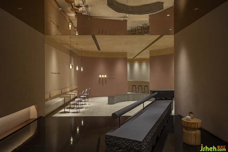 “顏系列”之下,本店的主題為“綰色”。在主要立面上,色彩以混入天然稻草泥的肌理漆為載體,自然粗糲的質(zhì)感帶來清新質(zhì)樸的感受。巖石造型的家具采用未經(jīng)過多加工的金屬材質(zhì),作為空間中的點(diǎn)綴,恰與溫潤的泥質(zhì)相互調(diào)和。