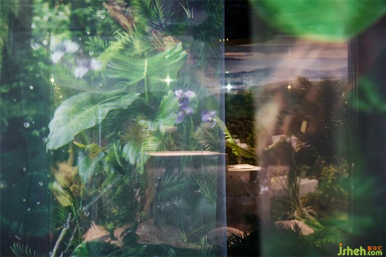 雨林區(qū)的營(yíng)造更符合當(dāng)下人們拍照打卡的習(xí)慣,由Seen Vision呈現(xiàn)的互動(dòng)影像畫(huà)面投射在若隱若現(xiàn)的紗幕上,人一旦經(jīng)過(guò),紗幕上群鳥(niǎo)飛舞,讓人仿佛置身于熱帶雨林之中。