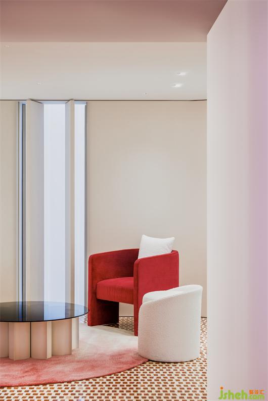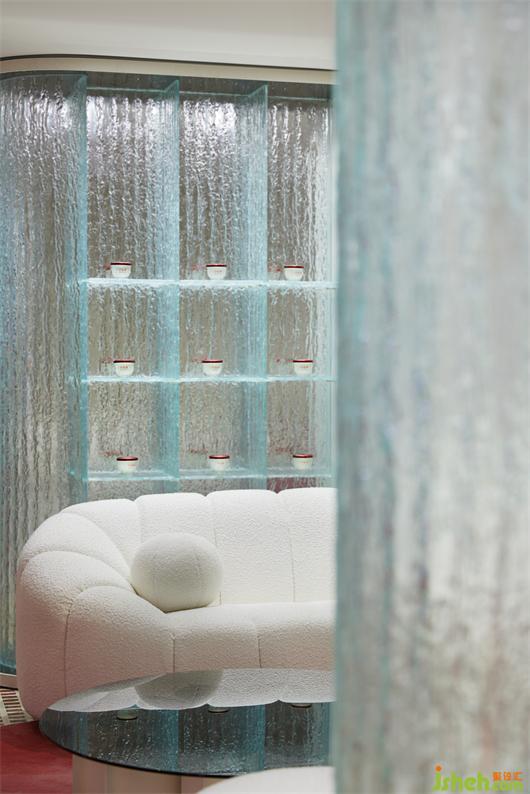 旗艦店設(shè)計(jì)師在VIP區(qū)墻面設(shè)置開(kāi)窗,巧妙地利用外立面的玻璃幕墻與內(nèi)部開(kāi)窗的關(guān)系,引入自然光線(xiàn),玻璃隔斷隱喻燕窩晶瑩剔透、富有顆粒感的肌理,共同形成一個(gè)半圍合空間,給人舒適的愉悅感。