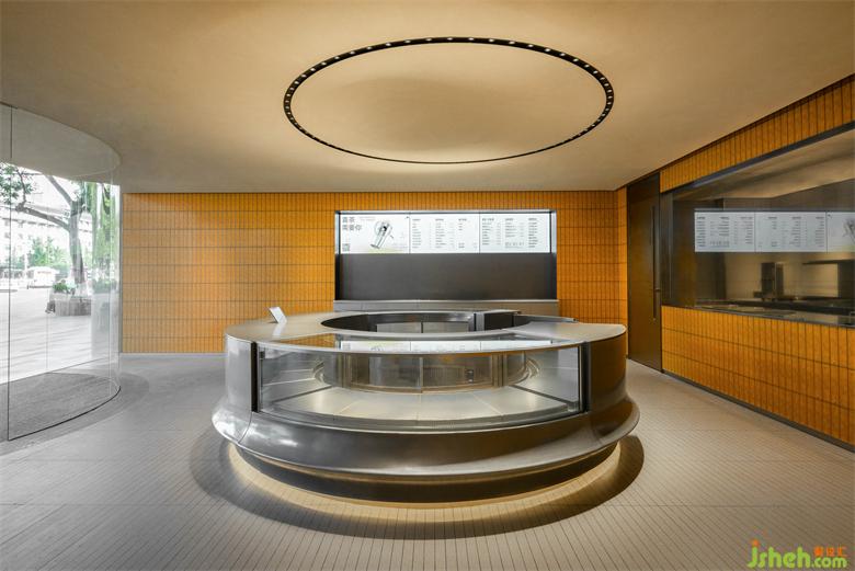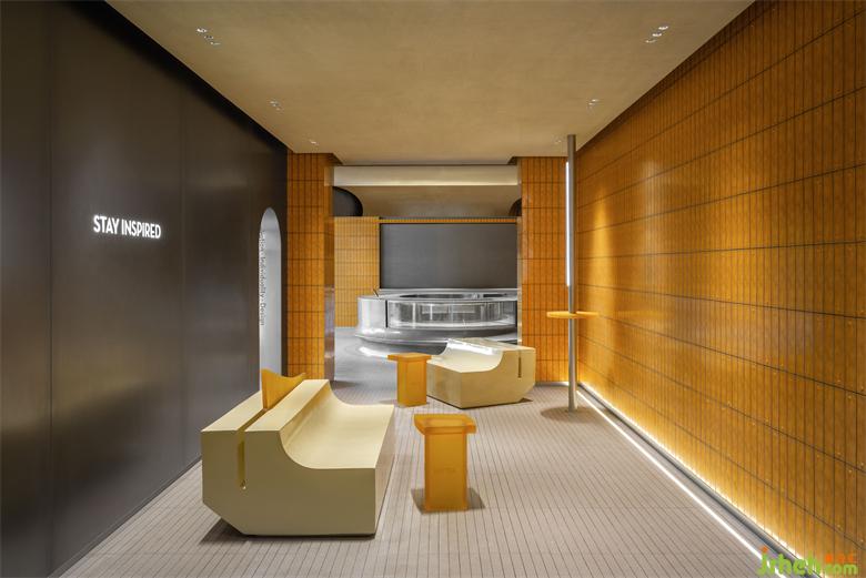 △環(huán)形的點(diǎn)單臺(tái)被大面積的黃砂巖組成的方形墻面包裹,兩種形態(tài)和材質(zhì)的碰撞營(yíng)造出靈感記憶點(diǎn)。