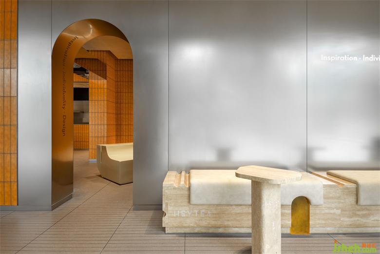 具有標(biāo)志性意義的拱門(mén)被金屬材質(zhì)包裹,宛如一道時(shí)空之門(mén)。喜茶設(shè)計(jì)穿過(guò)這道拱門(mén)進(jìn)入內(nèi)里空間,定制的黃色手工磚上,倒模形成的圓點(diǎn)凸起對(duì)應(yīng)著秦俑士官盔甲特有的鱗片圓點(diǎn),那些模糊的歷史文化印記再次浮現(xiàn)。