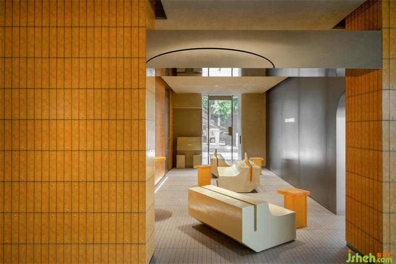 在金屬隔斷墻前,是一組不規(guī)則形狀的家具,半透明泛著黃光的樹脂搭配風(fēng)化感的洞石,座椅面料上的圖案是來(lái)自于絲綢之路畫卷中的編織圖騰及元素,內(nèi)里空間散落擺放的不規(guī)則石椅,均呼應(yīng)了西安這座城市的粗曠和底蘊(yùn)。
