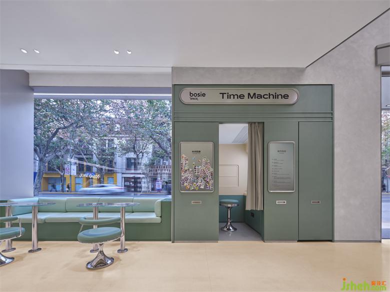 一層空間引入服飾區(qū)、零食區(qū)、冰淇凌區(qū)以及復(fù)古拍照區(qū),作為零售終端中必不可少的功能業(yè)態(tài)被賦予鮮明的社交屬性和奇幻感,體驗(yàn)和購(gòu)買(mǎi)的邊緣性被模糊,甚至發(fā)生了扭曲重合。探險(xiǎn)者們也早已將自己代入到時(shí)空旅行的角色當(dāng)中,對(duì)未知之域充滿了好奇和探索的欲望。