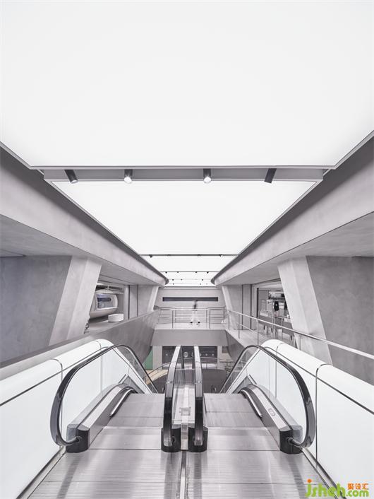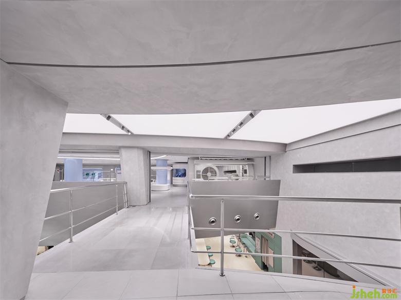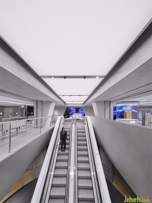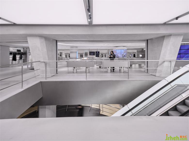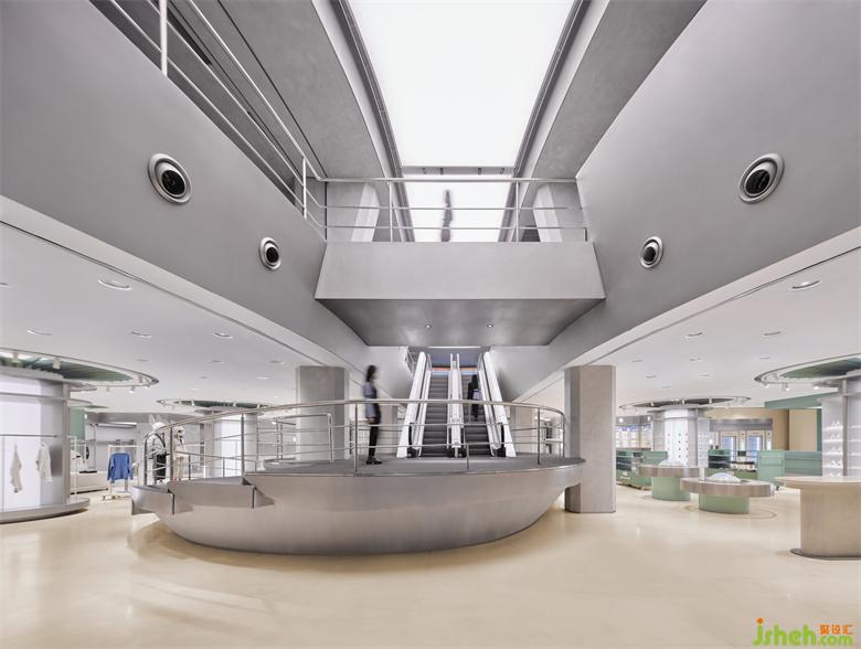 主體造型有著20世紀(jì)中葉粗野主義建筑的典型特征,復(fù)古科幻的太空風(fēng)格成為整個(gè)空間的底色。旗艦店設(shè)計(jì)弧形階梯平臺(tái)設(shè)計(jì)規(guī)避了扶手梯下方沉箱難題,又與發(fā)光扶手梯相連,通過(guò)屋頂柔軟的光源與大型金屬建筑體塊形成矛盾反差,營(yíng)造通往另一個(gè)空間的神秘昭示。