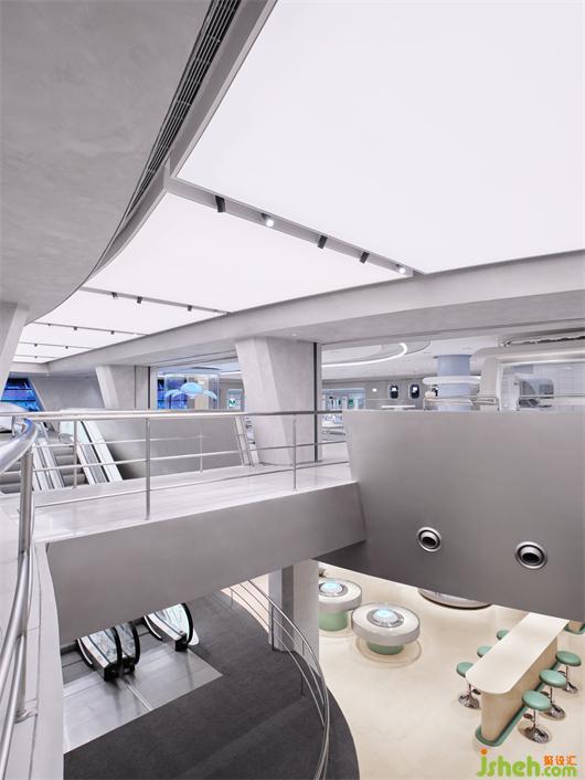 二層空間對應(yīng)故事腳本中的飛船本體,立品將這個空間設(shè)定為bosie實施重返星球計劃的重要實驗基地,將實驗室的場景與業(yè)態(tài)有機結(jié)合。圍繞中空區(qū)域,二層天花設(shè)置環(huán)形燈帶,模擬飛船內(nèi)部的科技感并引導(dǎo)探險者環(huán)繞前行。