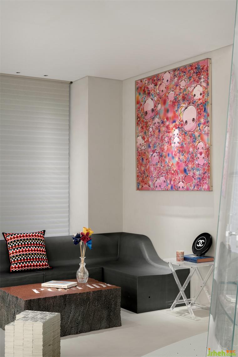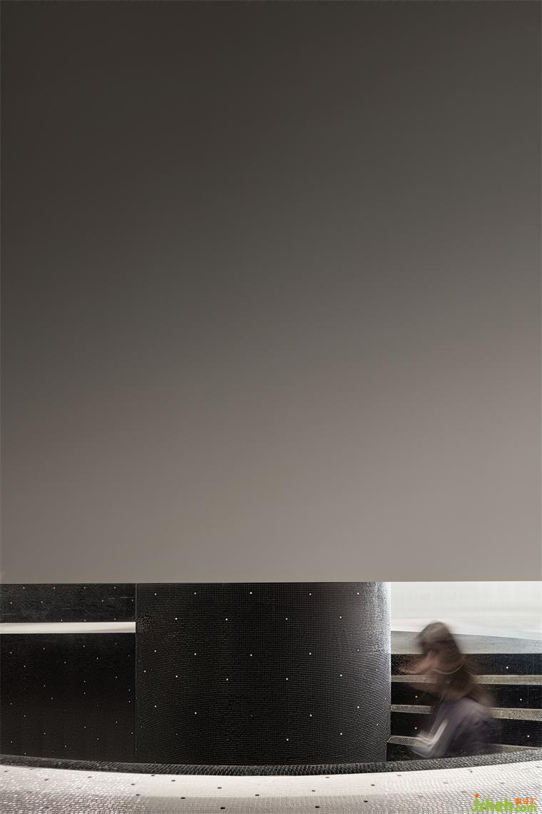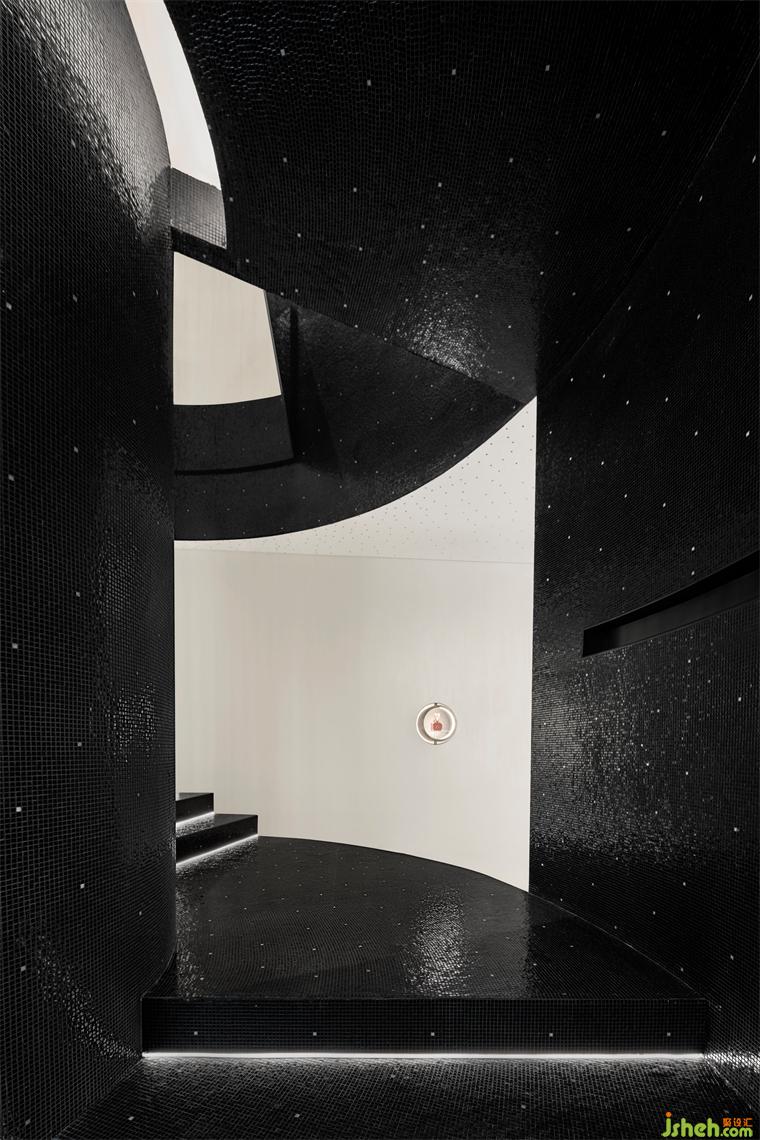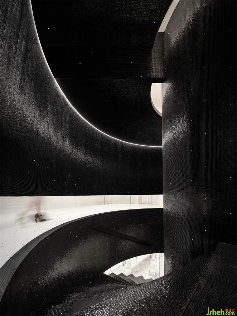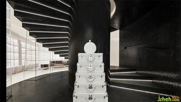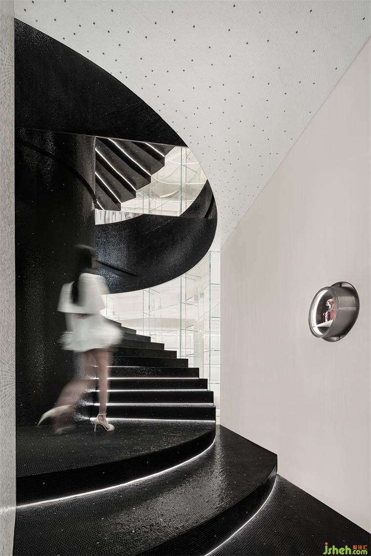 從樓梯進(jìn)入二層空間,視覺的反差在“黑”與“白”之間形成強(qiáng)烈的對(duì)比,裝修設(shè)計(jì)來滿足款式和顏色多樣的奢侈品服飾和珠寶的陳列需求。