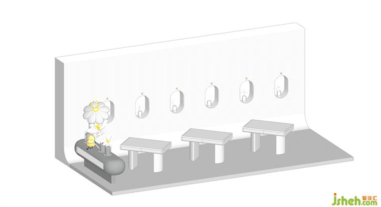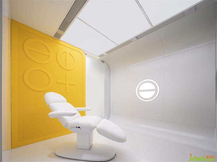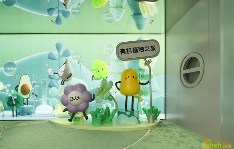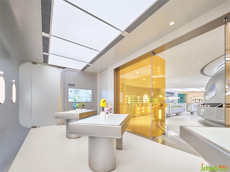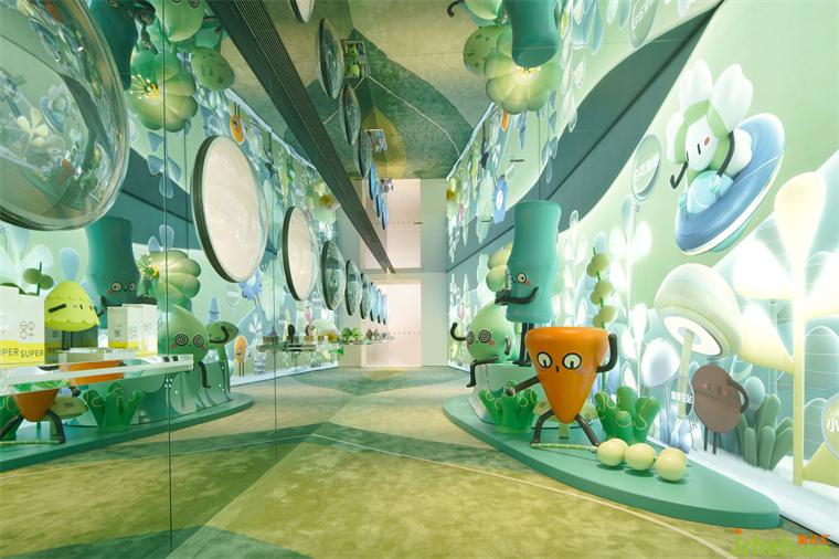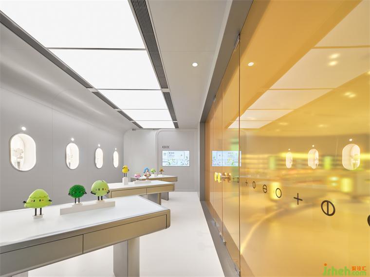 在空間動線的末端,設(shè)計師不忘緊扣腳本,將消費者帶入到故事腳本的高潮部分。設(shè)計師巧妙地將品牌的植物IP以裝置藝術(shù)的設(shè)計手法融入狹長的回廊中,通過動態(tài)燈箱模擬植物在實驗室中場景,裝修設(shè)計光源的閃動模擬植物呼吸的韻律,展現(xiàn)出植物蓬勃生長的強大能量。在沉浸式的場景中,消費者潛移默化地將植物的生長律動與品牌強調(diào)的天然純粹進(jìn)行聯(lián)想,裝修設(shè)計從而對品牌有了更清晰和深入的感知。
