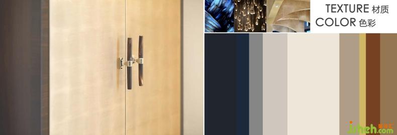 設計用材:茶鏡、磨砂玻璃、淺咖網石材、爵士白、黃鈦拉絲不銹鋼、皮革等