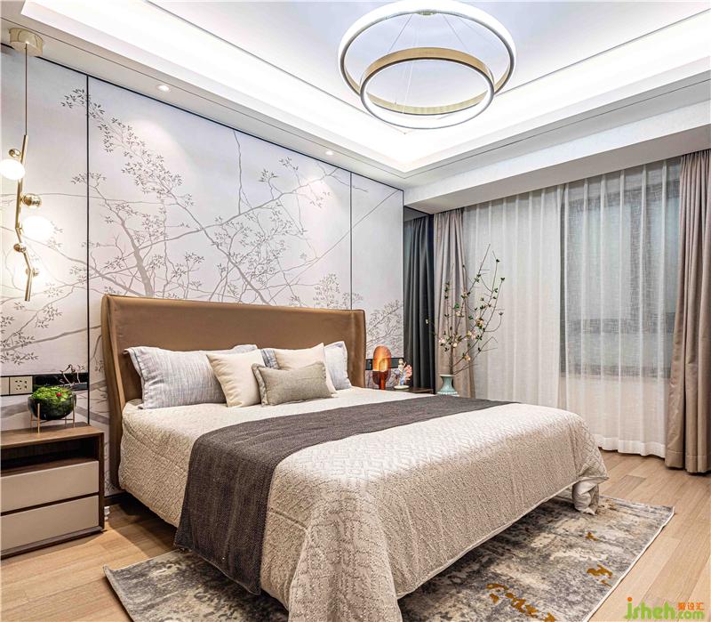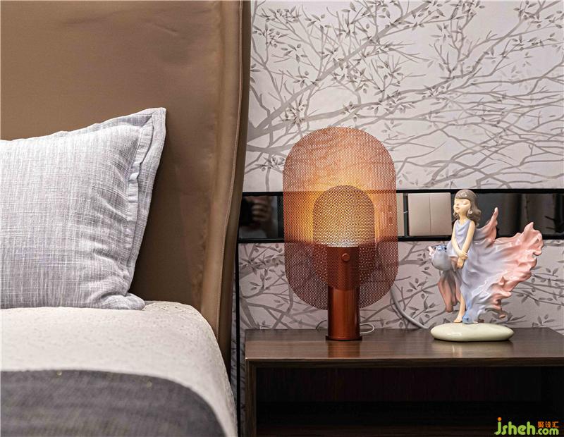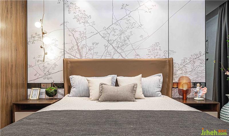 主臥墻面采用星甸梅花硬包墻布及燈飾設(shè)計(jì),為空間攜來自然活力,使居者在進(jìn)入空間之時(shí),自然感覺溫馨而安逸。