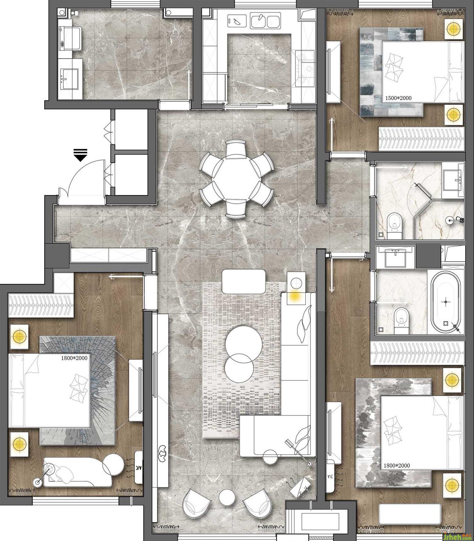 不同的臥室空間通過前期不同的硬裝材料運(yùn)用,搭配后期的軟裝配飾,營造出多樣的空間個(gè)性主題及居住氛圍。