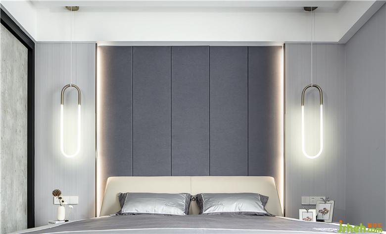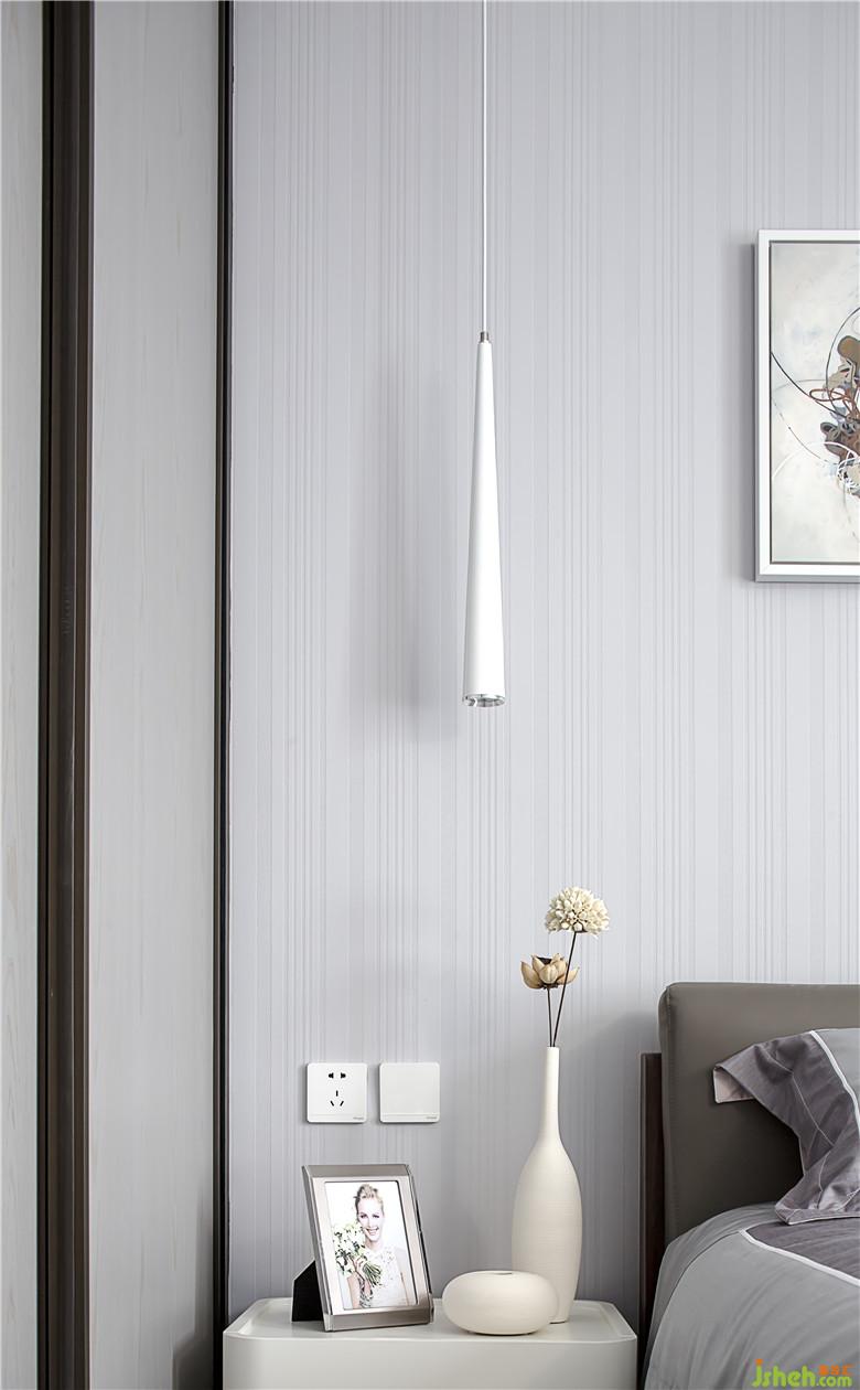 次臥:細(xì)密豎紋墻紙,尖錐型吊燈,包括床品,花瓶的紋路。室內(nèi)設(shè)計(jì)師處處都將線條的延伸感凸顯得淋漓盡致!整體顯得整潔而又高挑!