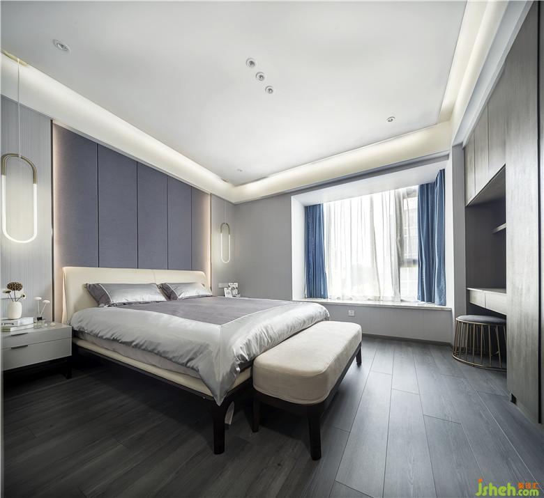 主臥:室內(nèi)設(shè)計(jì)師用回形針形狀的吊線燈、圓形的妝凳、圓角矩形的床尾凳,都讓整潔清新的臥室里有著不可或缺的親切感。綢緞面的床品則在整個(gè)啞光的世界中閃現(xiàn)著一絲華麗。