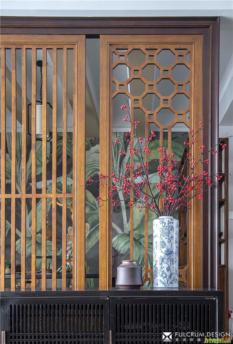 室內(nèi)設(shè)計(jì)師采用鏤空的隔斷來(lái)保持空間的獨(dú)立性和連貫性,也避免了茶室光線不足的尷尬。各種顏色的混搭,水晶鐵藝吊燈的點(diǎn)綴,讓中式變得更加鮮活自然。