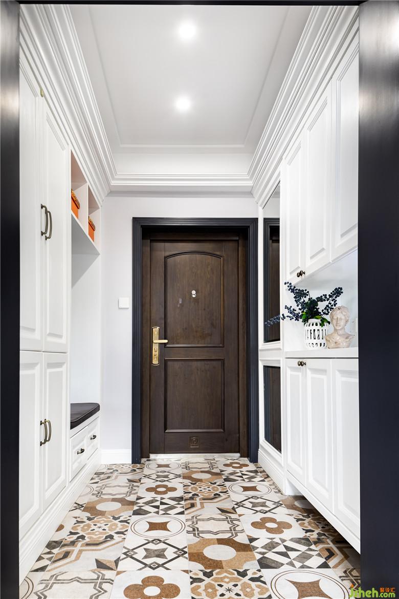 進門處運用廚房與原始暗衛(wèi)的墻體,室內(nèi)設(shè)計師打造了實用與顏值并重的玄關(guān)區(qū)。(寶寶再也不用站著換鞋啦。)