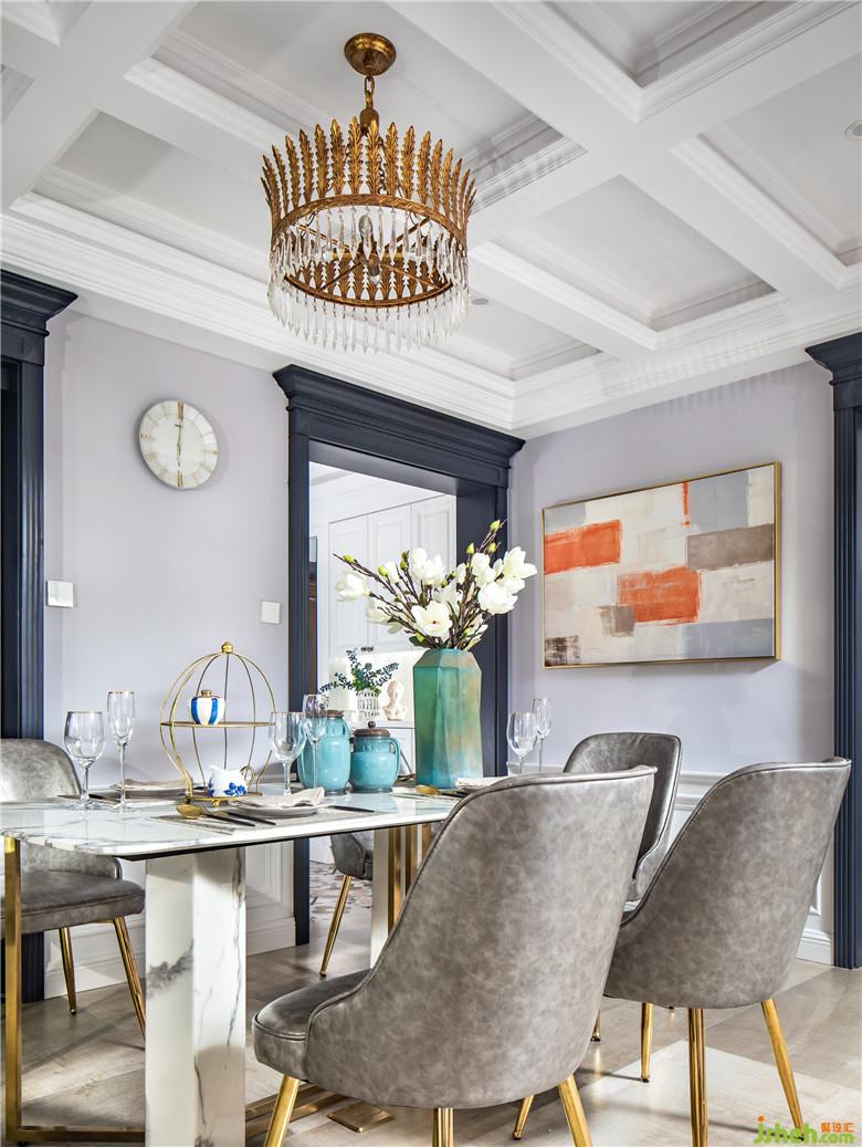 室內(nèi)設(shè)計師使用冷色調(diào)的居家氛圍,金色的裝飾與白色石材餐桌在視覺上起到輕盈靈動的效果。啞光素面的水泥磚加入了隨意現(xiàn)代的生活氣息,同時在復(fù)古線條的硬裝中也達到了軟裝層次的過渡。