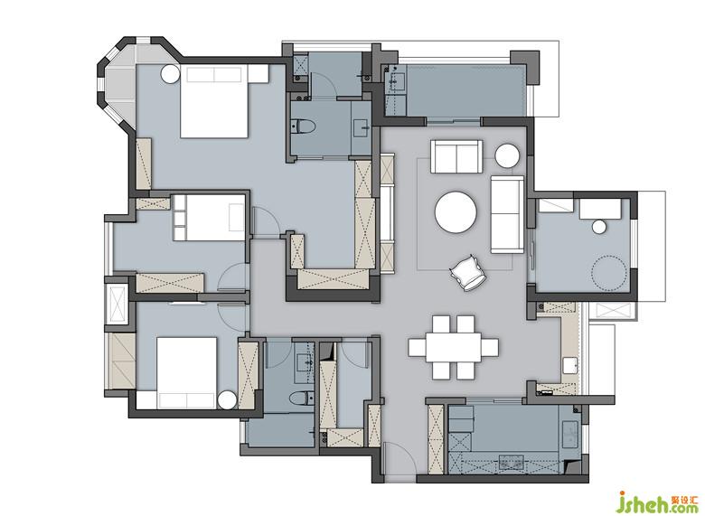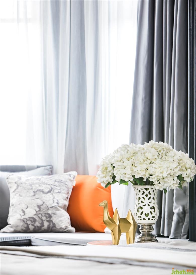 大大的八角窗區(qū)域,沿有空間的軸線(xiàn),形成了特定的坐塌區(qū)域。不僅舒適和實(shí)用,更將劃分后的主臥不再有雞肋的視角,放眼望去也都是清爽宜人。