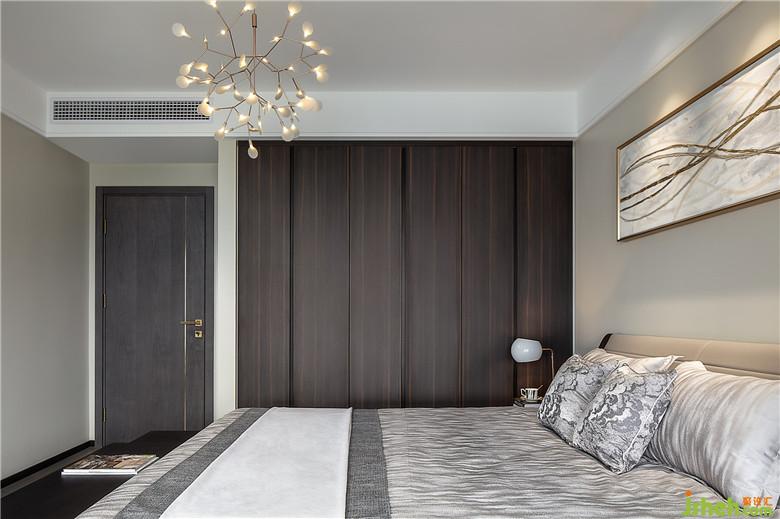 次臥,淺駝色的墻面,胡桃木的柜門,淺灰的床品。室內(nèi)設計師讓空間有限的臥室也顯得溫情脈脈。整個臥室配色十分簡潔沉穩(wěn),亦不乏明快。蒲公英吊燈,讓臥室又顯得有些浪漫。