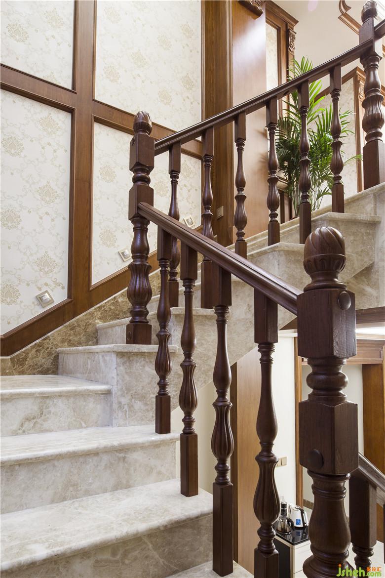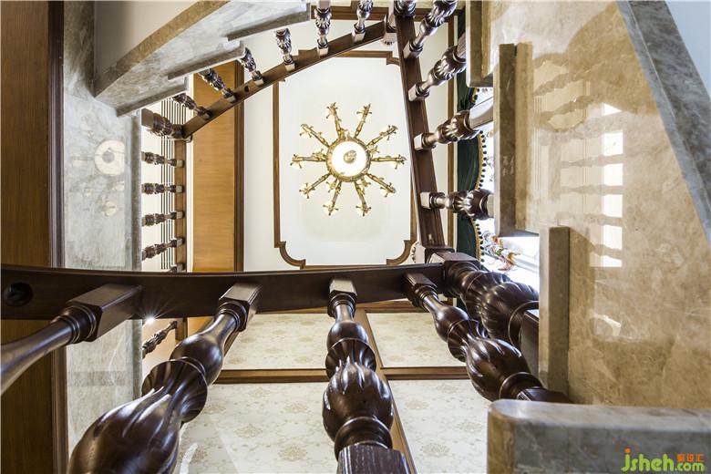 旋轉(zhuǎn)樓梯設(shè)計配合頂面的造型處理尤其大氣,復(fù)古樣式的樓梯欄桿扶手,曲折圓潤而上,將空間劃分得通透而豁達。