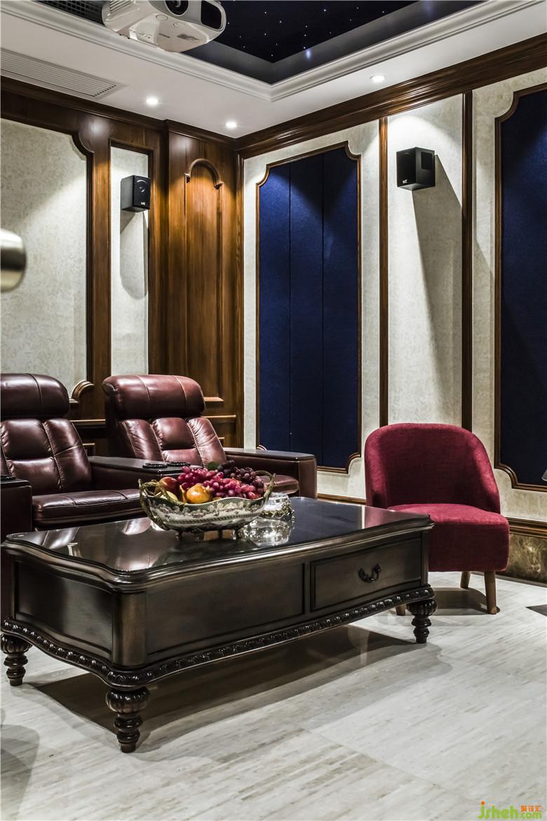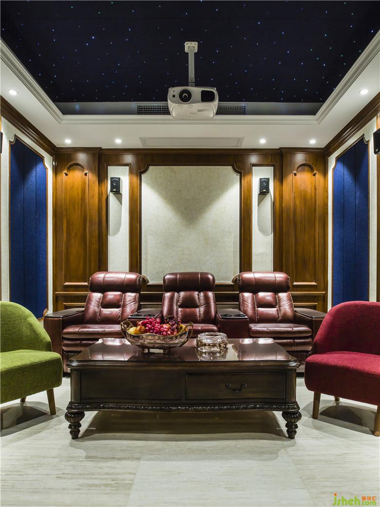 多功能視聽室拋棄常規(guī)的沉悶,裝飾部分別具一格,延續(xù)整體家居風格,但在色彩上跳躍活力,星空頂與墻面聲學(xué)功能材質(zhì)完美結(jié)合。