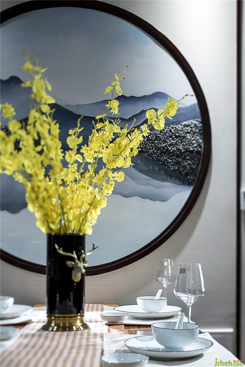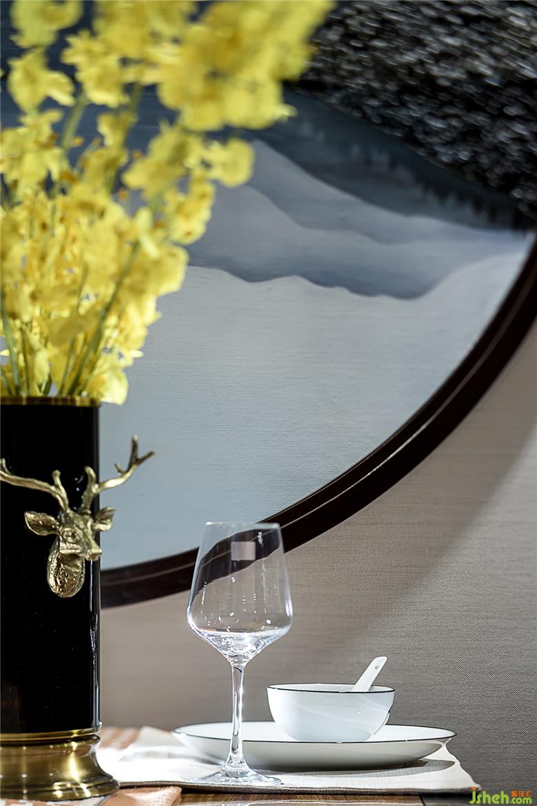 ▲室內(nèi)設(shè)計(jì)師用纖細(xì)的線條從頂面垂順而下,用留白的墻面做餐廳背景,山水立體畫用于點(diǎn)綴,立顯磅礴氣勢,彰顯出高雅的空間格調(diào)。