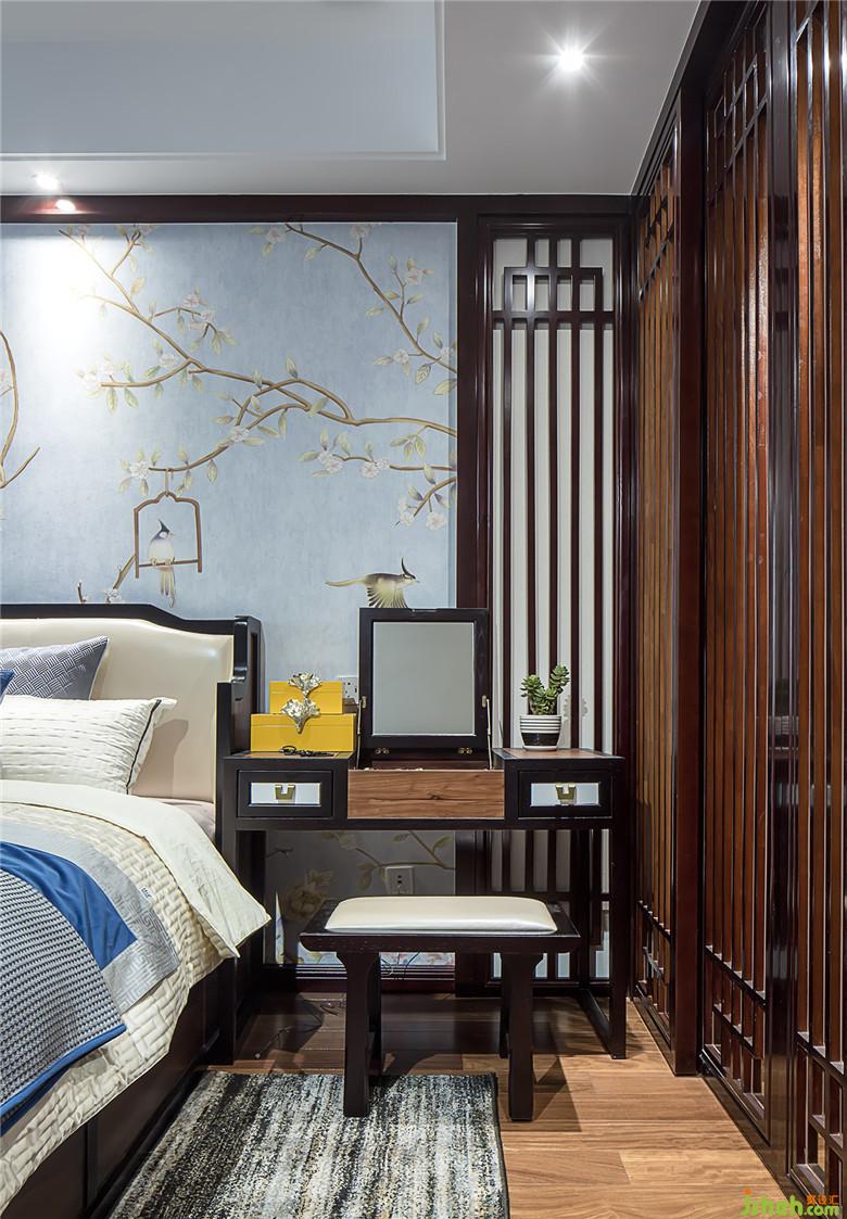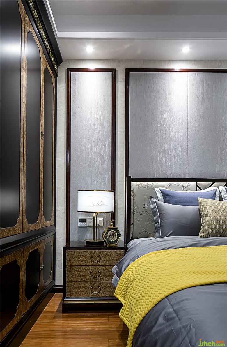 ▲次臥,采用方木嵌軟包的床頭架,既保留東方質(zhì)樸的氣韻又不失恬淡,背景取代了繁瑣的雕花,用風(fēng)格獨(dú)特的布飾面結(jié)合實(shí)木線條彰顯出剛?cè)岵?jì)。