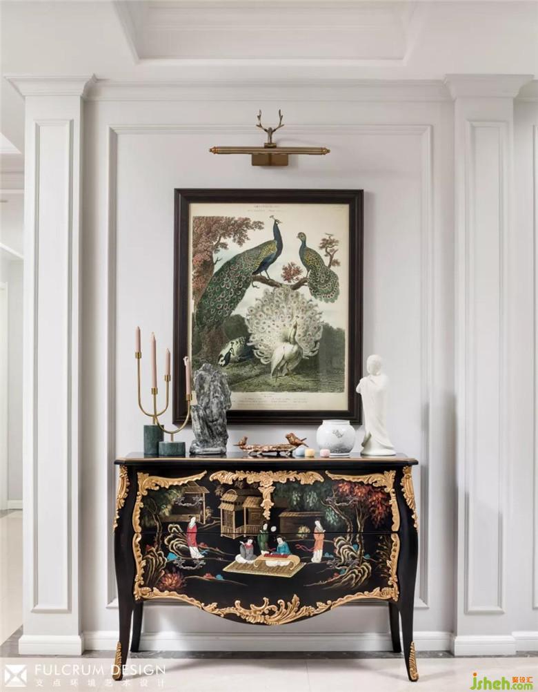 整體美式的框架下,帶有濃郁的東方色彩的斗柜和飾品讓人眼睛一亮,東西方風(fēng)格的對(duì)撞反而帶來別樣的風(fēng)味。