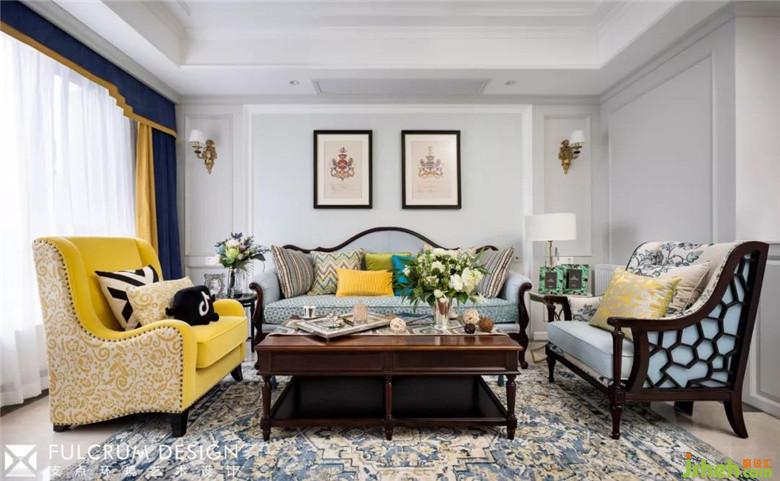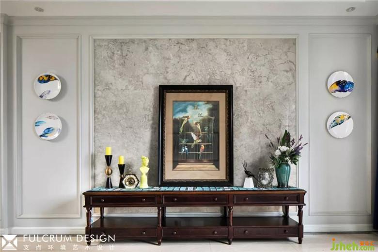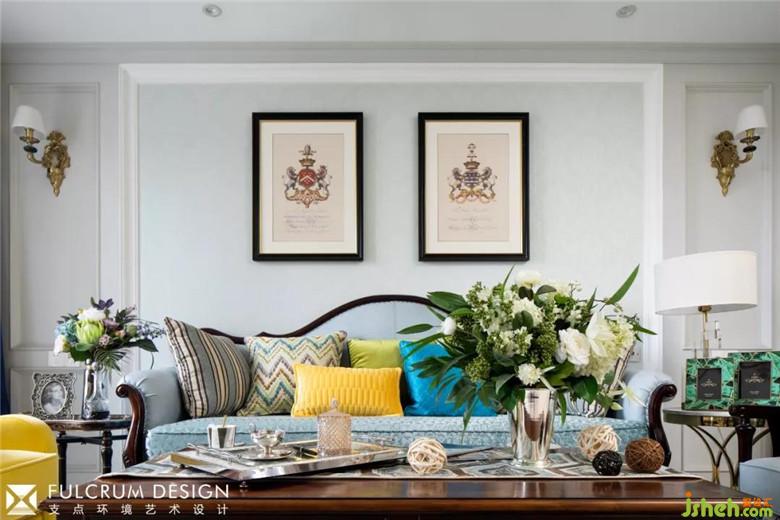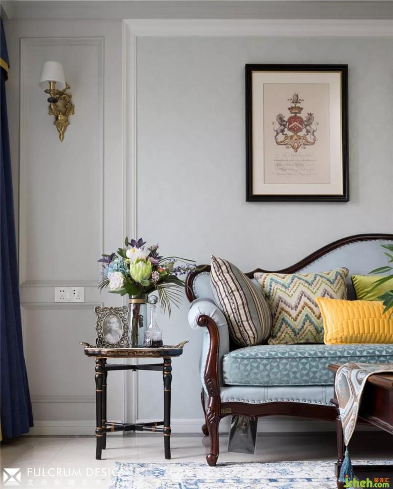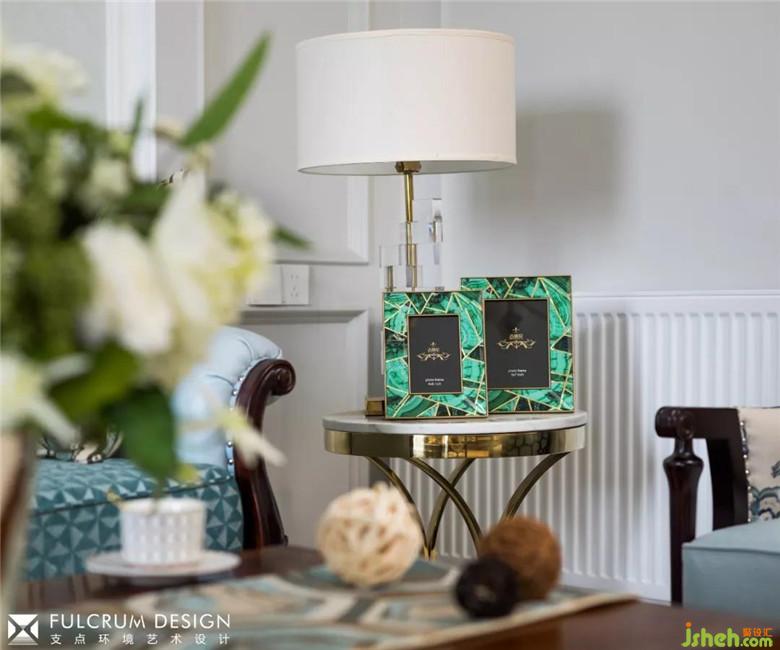 客廳里淺綠的沙發(fā)背面的暗紋墻紙配合淺灰的墻面,顯得清爽淡雅。帶有傳統(tǒng)美式元素的家具,純銀的古董茶杯,帶貴族族徽的裝飾畫跟現(xiàn)代風(fēng)格的墻面大理石,掛飾相映成趣,給人一種時(shí)空穿梭感。