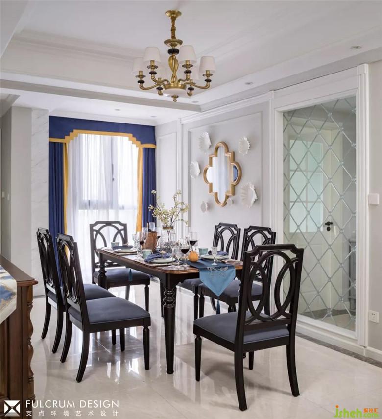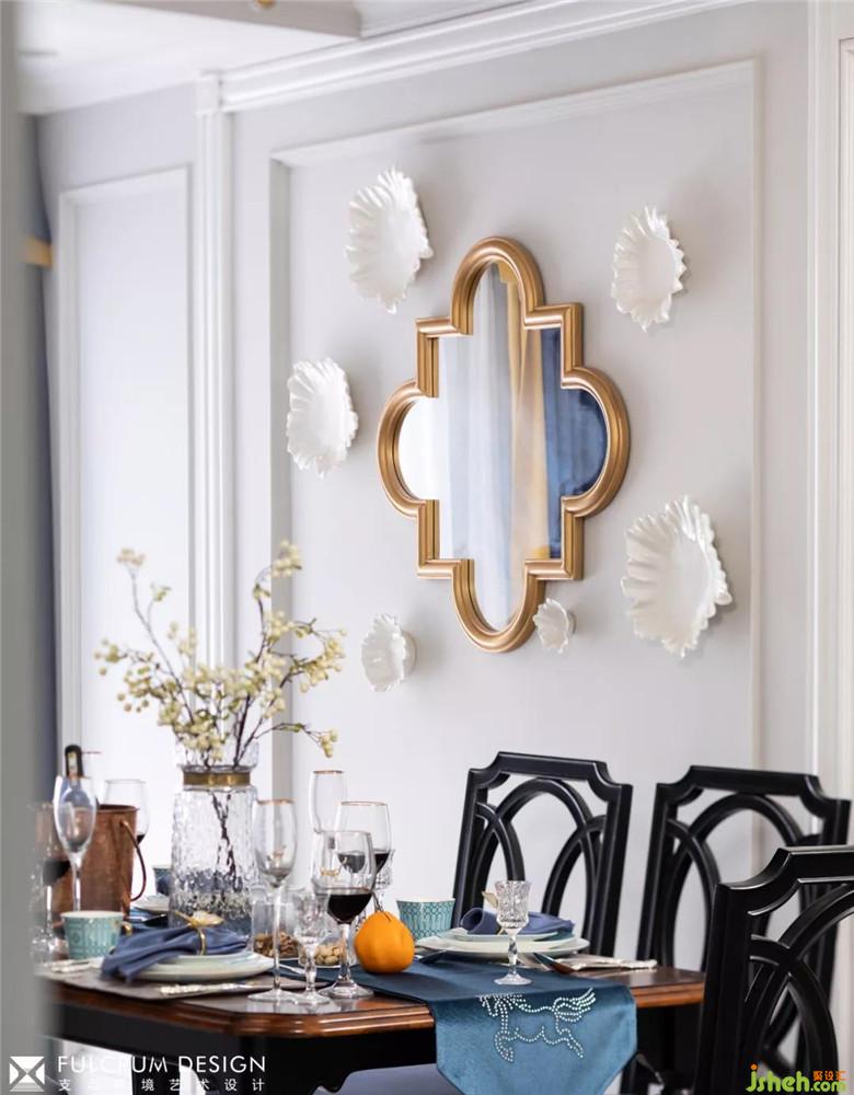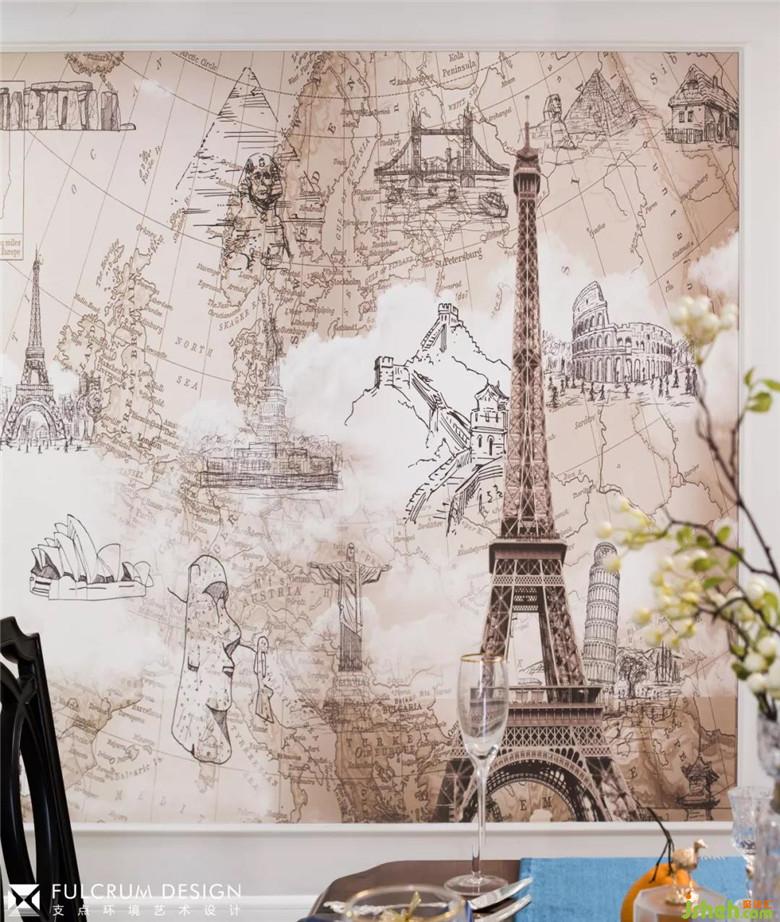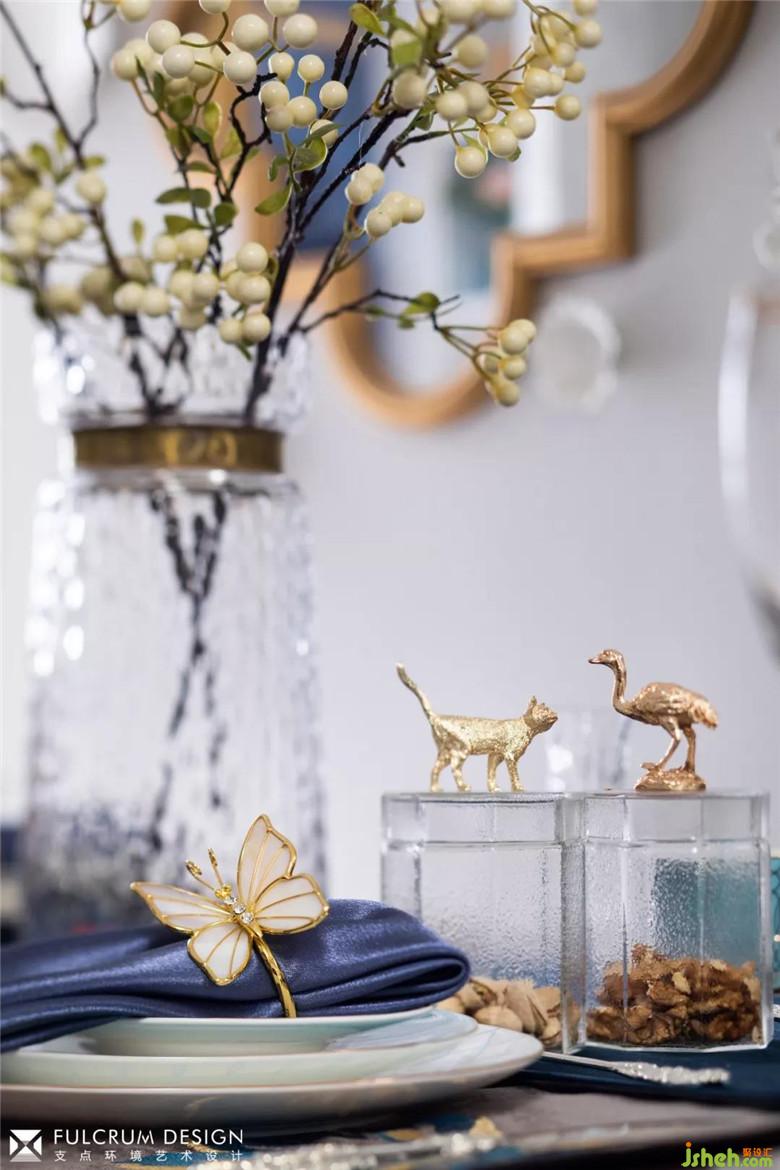 深色的方形餐桌椅和深藍色的窗簾如同餐廳的定海神針給了深邃莊重的基調(diào),而墻上的白花掛件和花型掛鏡,還有埃菲爾鐵塔的墻紙則帶來了引人遐思的浪漫。蝴蝶造型的餐巾扣和貓與鴕鳥造型的儲物罐給餐桌也帶來了些許情趣。