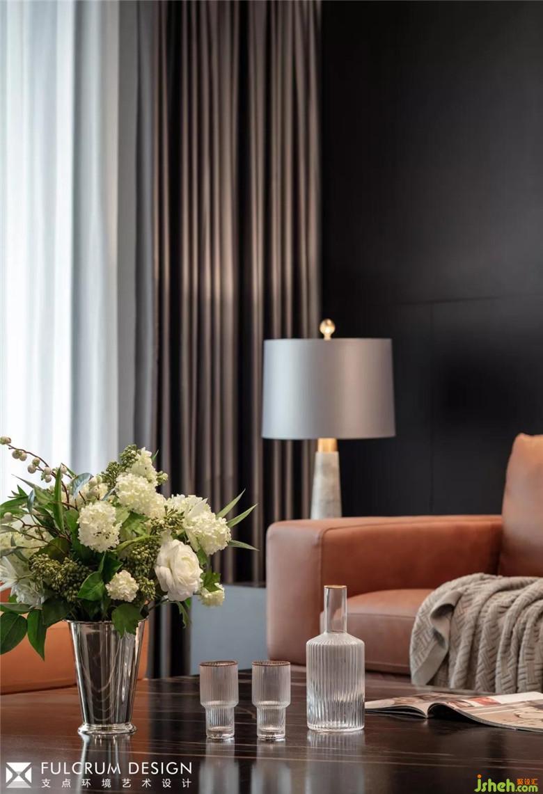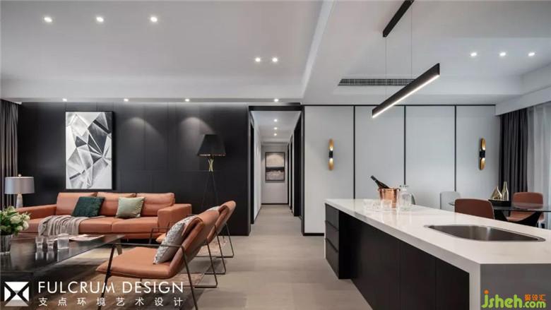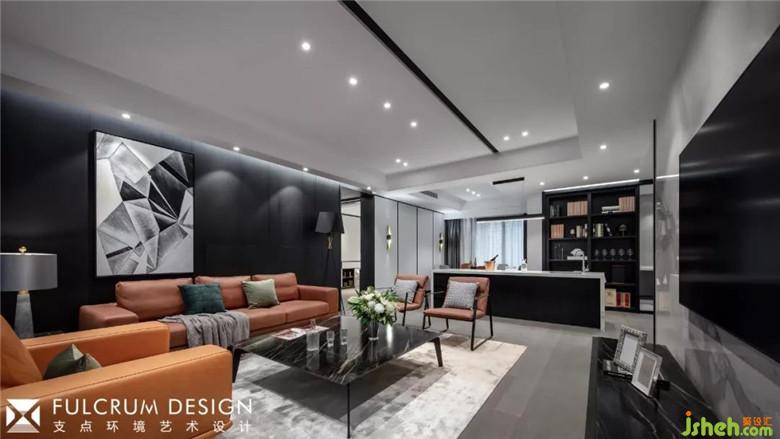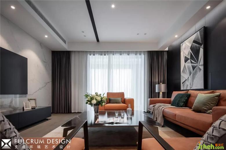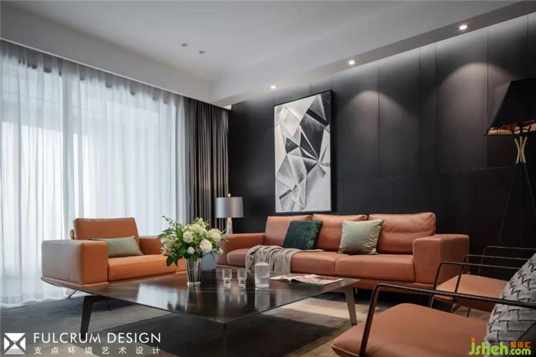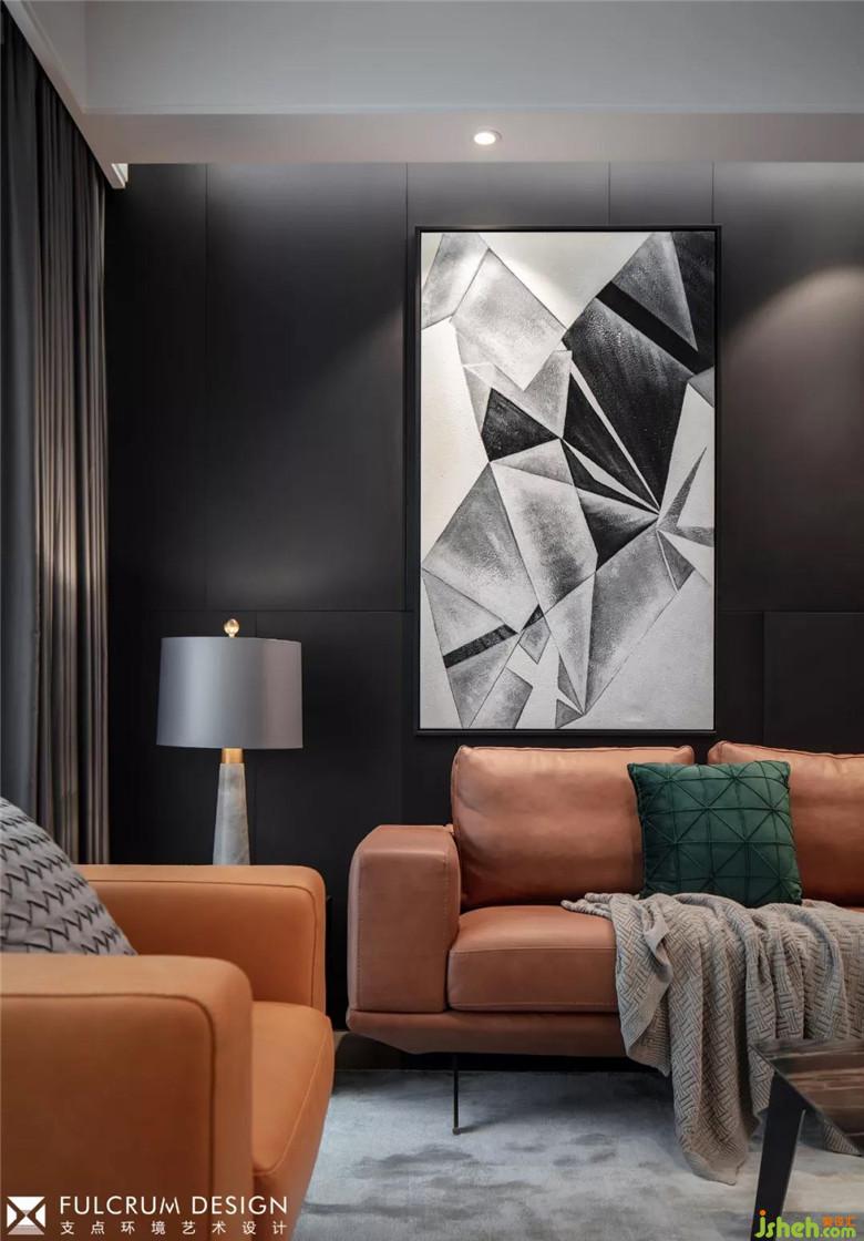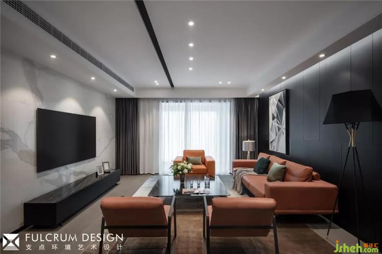 電視背景墻意大利巖板,沙發(fā)背景墻板,以及黑色啞光金屬這些不同材質(zhì)相互碰撞,以及恰當?shù)墓庥皩^(qū)域空間揉為一個整體。