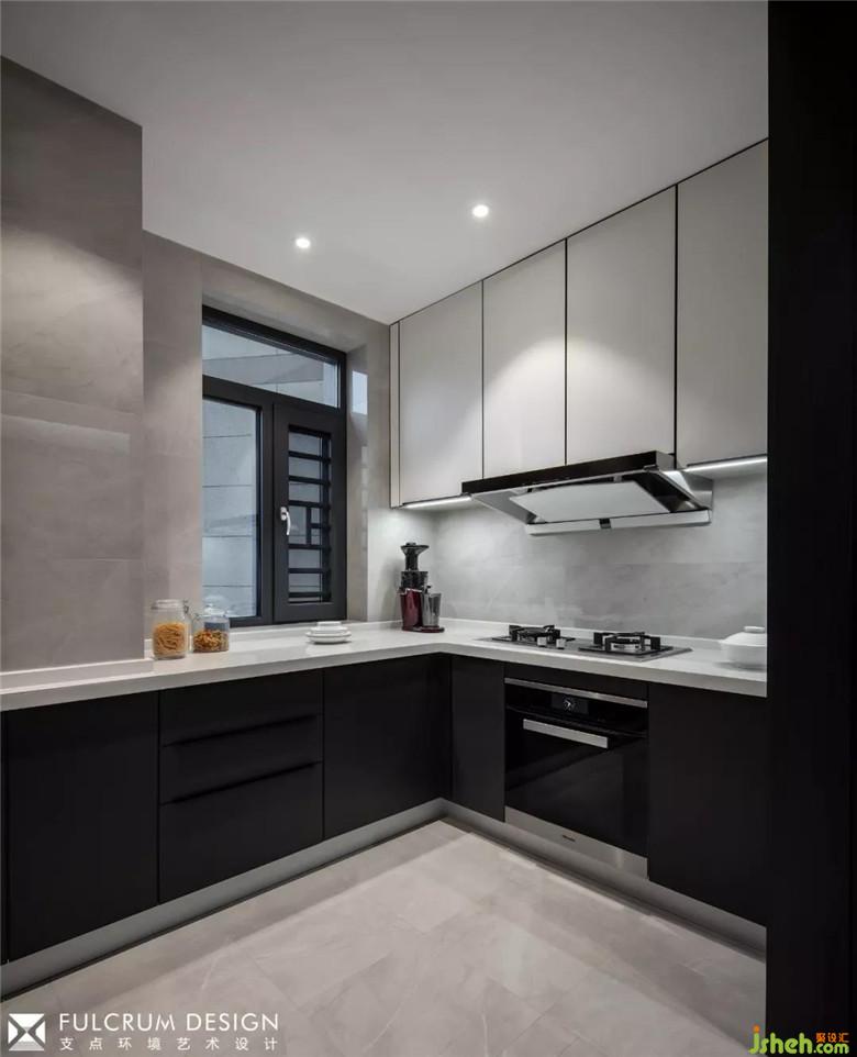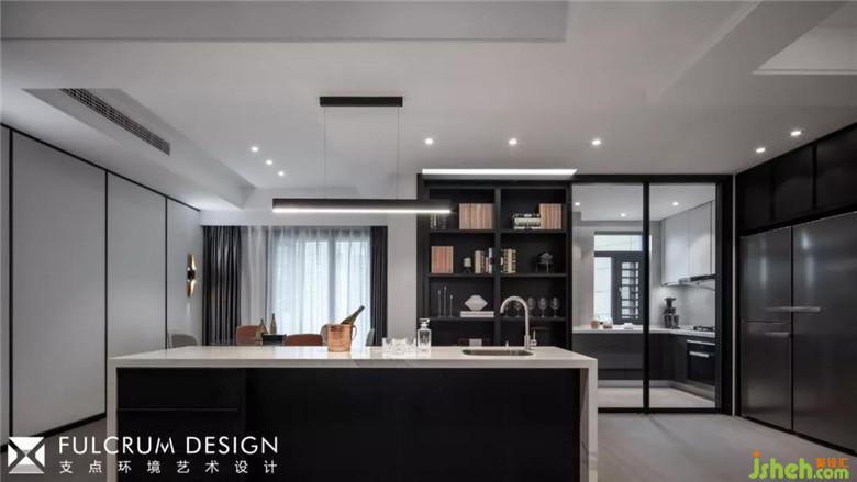 窄邊框的單扇玻璃梭門,即可以當(dāng)酒柜的隔斷門,也可以隔開廚房與餐廳之間空間,避免油煙困擾。櫥柜采用進口西班牙巖板材質(zhì),突出整體現(xiàn)代風(fēng)格色彩和質(zhì)感。