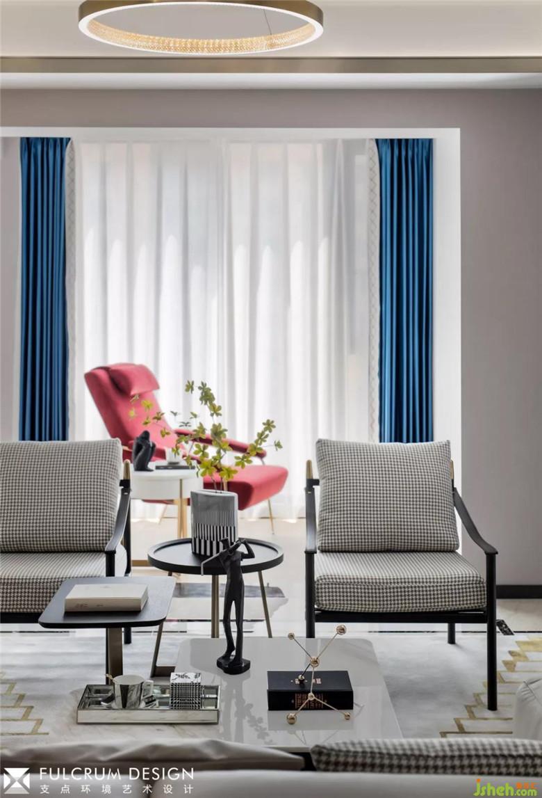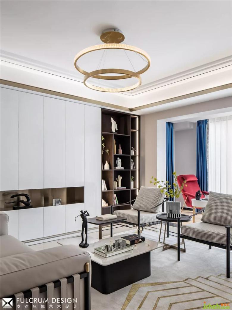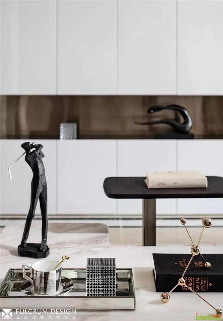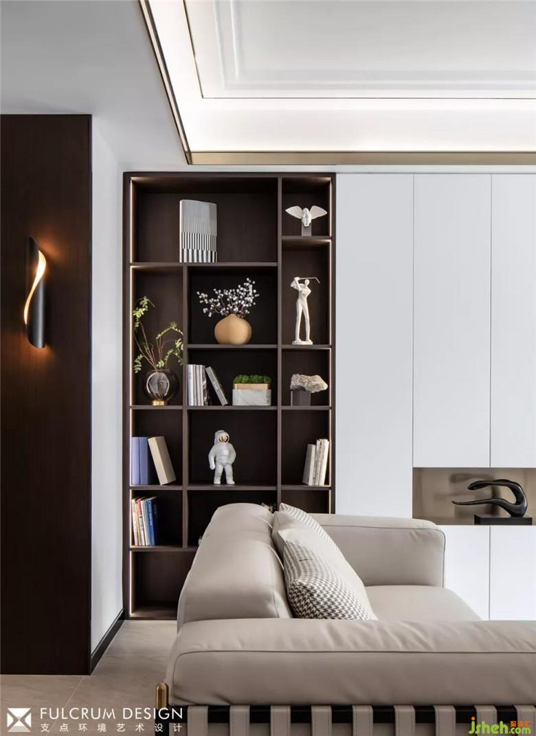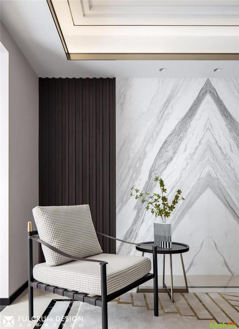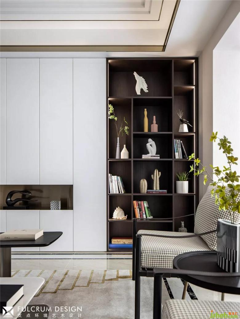 ▲客廳的功能性與藝術(shù)性尋求平衡,主角不在是電視,開放式側(cè)光展架陳列了隨手可及的書籍與裝飾品,對坐的沙發(fā)椅中間安置了高低錯落的的大理石茶幾,提供了更多便捷性的同時充滿雕塑藝術(shù)感。