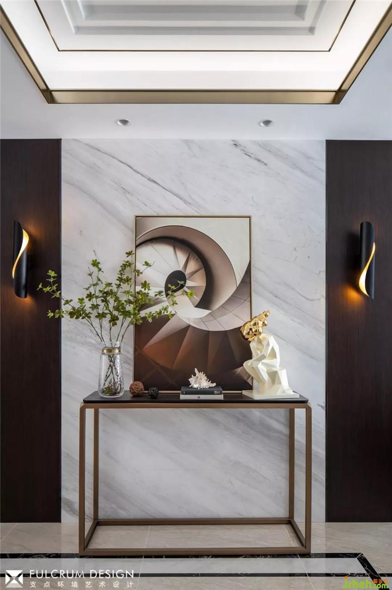 ▲設(shè)計的工藝細節(jié)豐富了空間的變化,頂面內(nèi)層增加跌級,吊頂用金屬線腳勾勒,連續(xù)跌宕,仿佛懸置了畫框。玄關(guān)桌上思想者雕塑在蜿蜒向上的樓梯旁沉思,墻面兩側(cè)深色木紋墻板的映襯下,大理石上的天然紋理充滿流線的動感。裝修公司