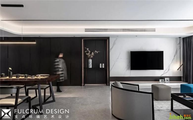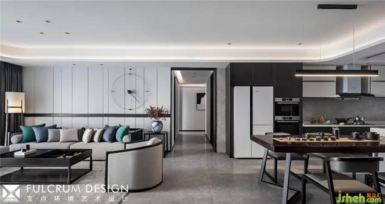 進(jìn)門處衛(wèi)生間門以隱藏門方式處理,和進(jìn)門長排儲(chǔ)藏柜融為一體。大面積黑色木飾面設(shè)計(jì)讓空間更顯整體性,黑白色的撞色設(shè)計(jì)與餐廳背景設(shè)計(jì)相呼應(yīng),黑白兩種材質(zhì)有節(jié)奏的相互拼湊在一起,裝修公司給空間注入了強(qiáng)烈的現(xiàn)代藝術(shù)感,也映照了我們每日律動(dòng)的生活,讓置身于此的人可以無負(fù)擔(dān)地遠(yuǎn)離都市喧囂。