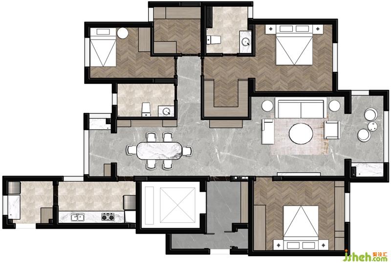2、儲藏空間配置安排??筒蛷d公共區(qū)都配備儲藏柜以滿足后期零碎物件收納,便于后期保持居家整潔。房間內為男女主人分別配備了衣帽間,以滿足兩位時尚達人的衣物安置需求,預留的兩間次臥室也各自配套了儲藏柜。