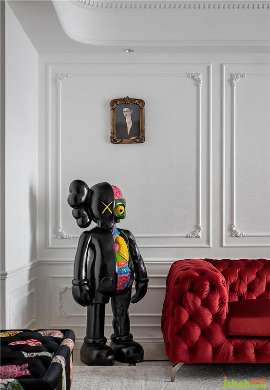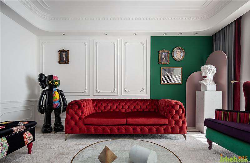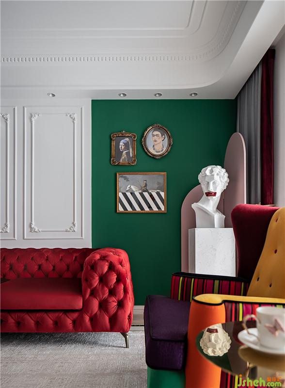 ▲這是一個色彩豐富的客廳。亮白色的環(huán)境打造了一個透明的舞臺,純凈的墻面上線條勾勒出優(yōu)雅的法式風情,濃烈的紅色天鵝絨沙發(fā)與局部的綠色墻面打造一個充滿浪漫與熱情并存的派對樂園。