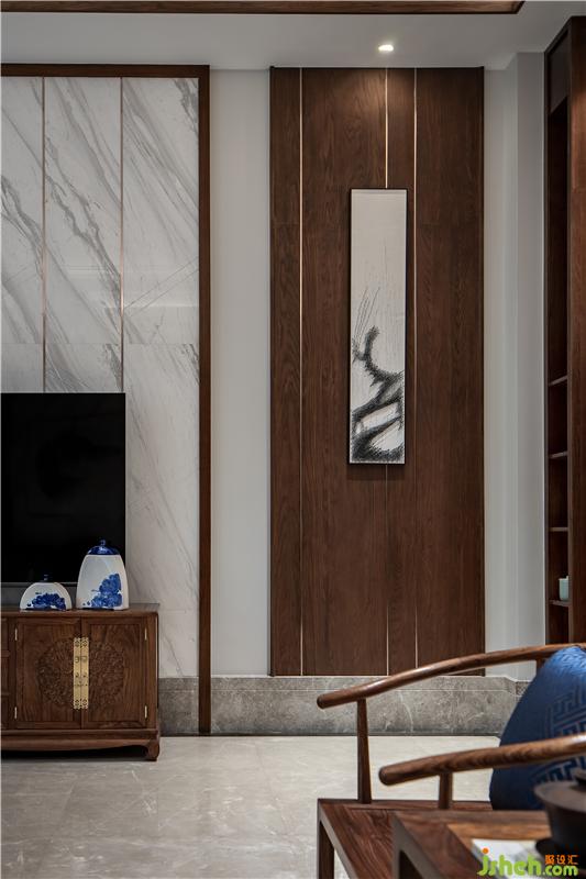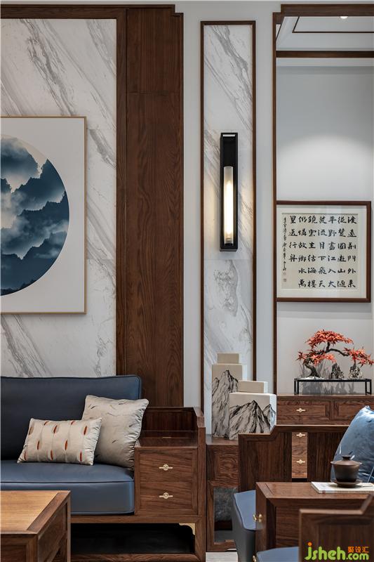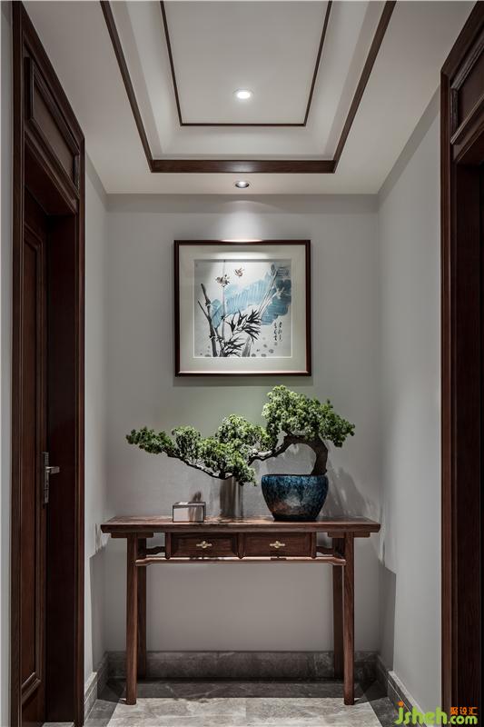 ▲一處幽靜的玄關(guān)。幾案上青松英姿傲意、一幅枯筆掛畫引入空間,將它們放在恰到好處的位置,營造合適的光影,頓生一股閑寂的氣質(zhì)。
