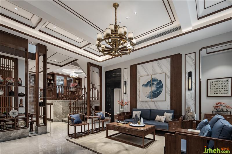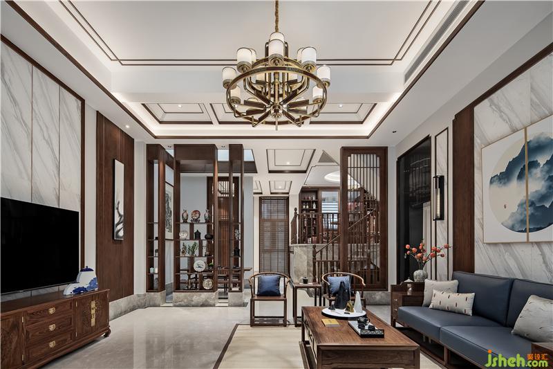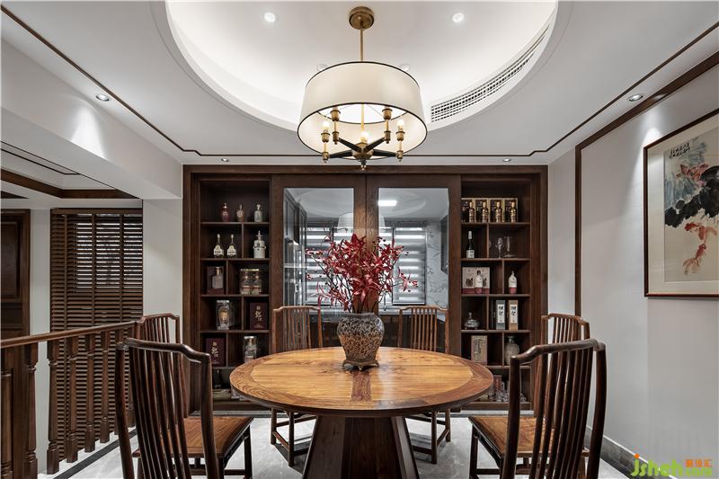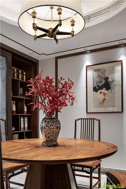 ▲拾級而上,置身于餐廳。圓形天花搭配傳統(tǒng)圓桌體現(xiàn)中國傳統(tǒng)空間形式的概念美,燈籠樣式燈罩、青花瓷與紅色楓葉的陪襯下,韻味自發(fā),襲面而來是青木之香,入口之間是五谷之味;縱使風(fēng)塵仆仆歸家,落座共餐,時間恰好。
