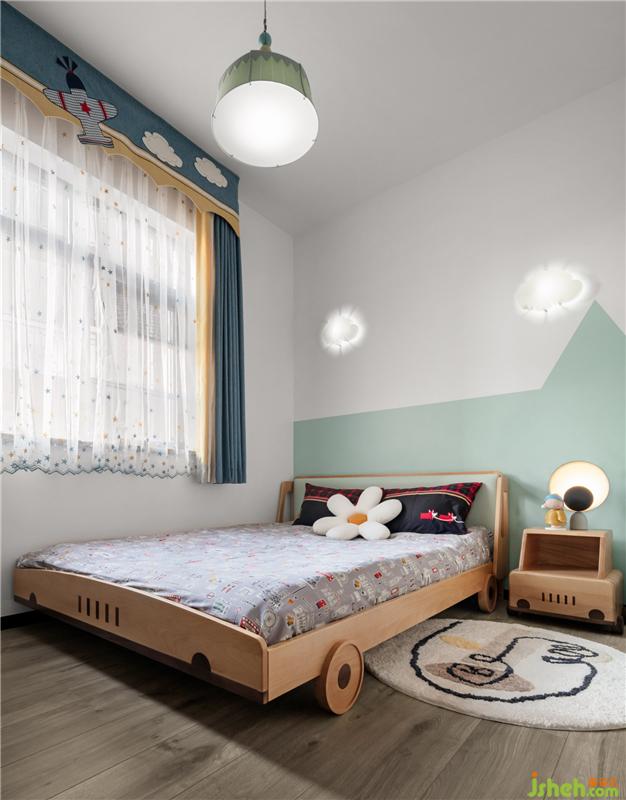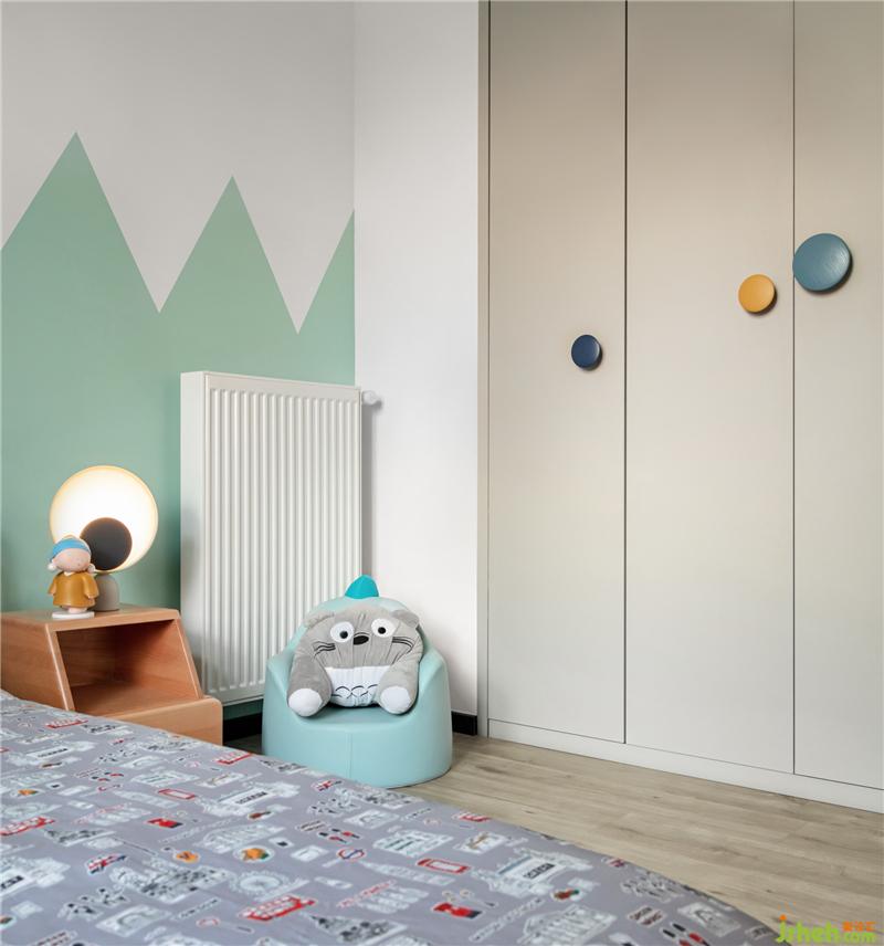 兒童房貫穿了整個設(shè)計的思路,墻面幾何形的森林搭配原木色的兒童家具,