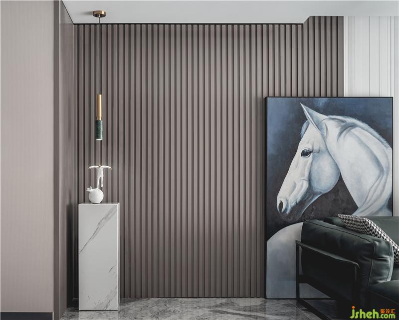 越過玄關(guān)的喧鬧,墨綠和淺灰、真皮和千鳥格、石材或者海浪、所有的質(zhì)感仿佛都凝聚在白馬回眸的那一瞬。在這個(gè)空間,任何色彩都融合在場所整體感受中。