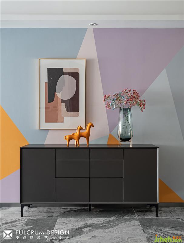 馬的橘色和墻壁的橘色互相呼應(yīng),拼色的壁畫在這個(gè)開闊的空間內(nèi)成了。沒有造型的焦點(diǎn),抽象的充滿愛意的裝飾畫能很好的柔化幾何線條產(chǎn)生的割裂感。紅藍(lán)相間的滿天星能讓主人感受到回家的熱情。